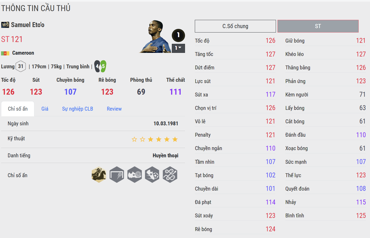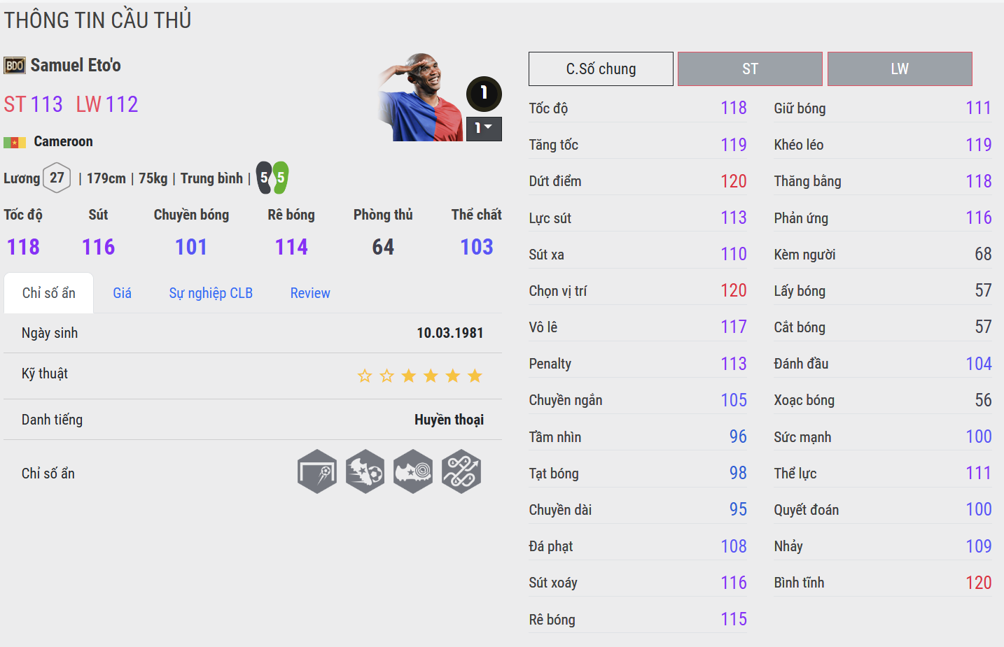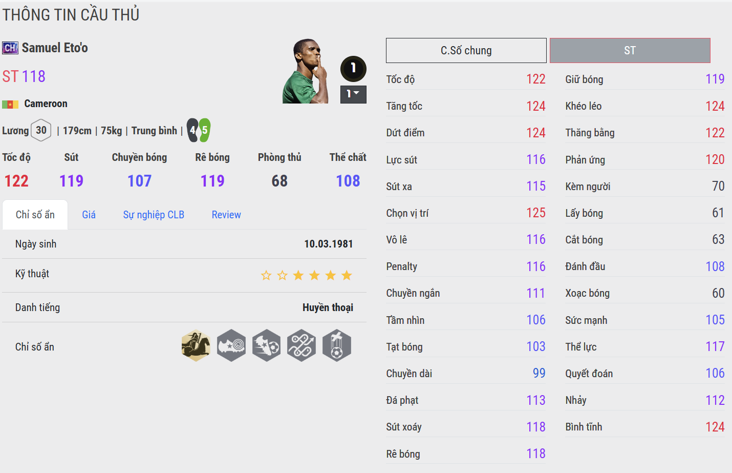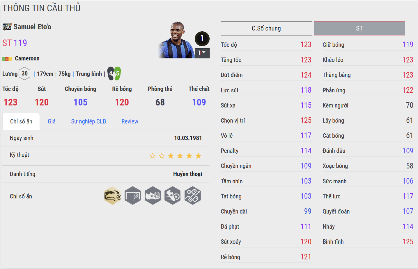 Eto’o CH nổi bật ở độ mượt và sự ổn định trong thực chiến. Những pha bứt tốc ngắn, chạy chỗ chéo và dứt điểm một chạm cho cảm giác rất “đã tay”. Mùa thẻ này thể hiện rõ bản năng sát thủ của Eto’o trong vòng cấm, đặc biệt nguy hiểm khi đối mặt GK.