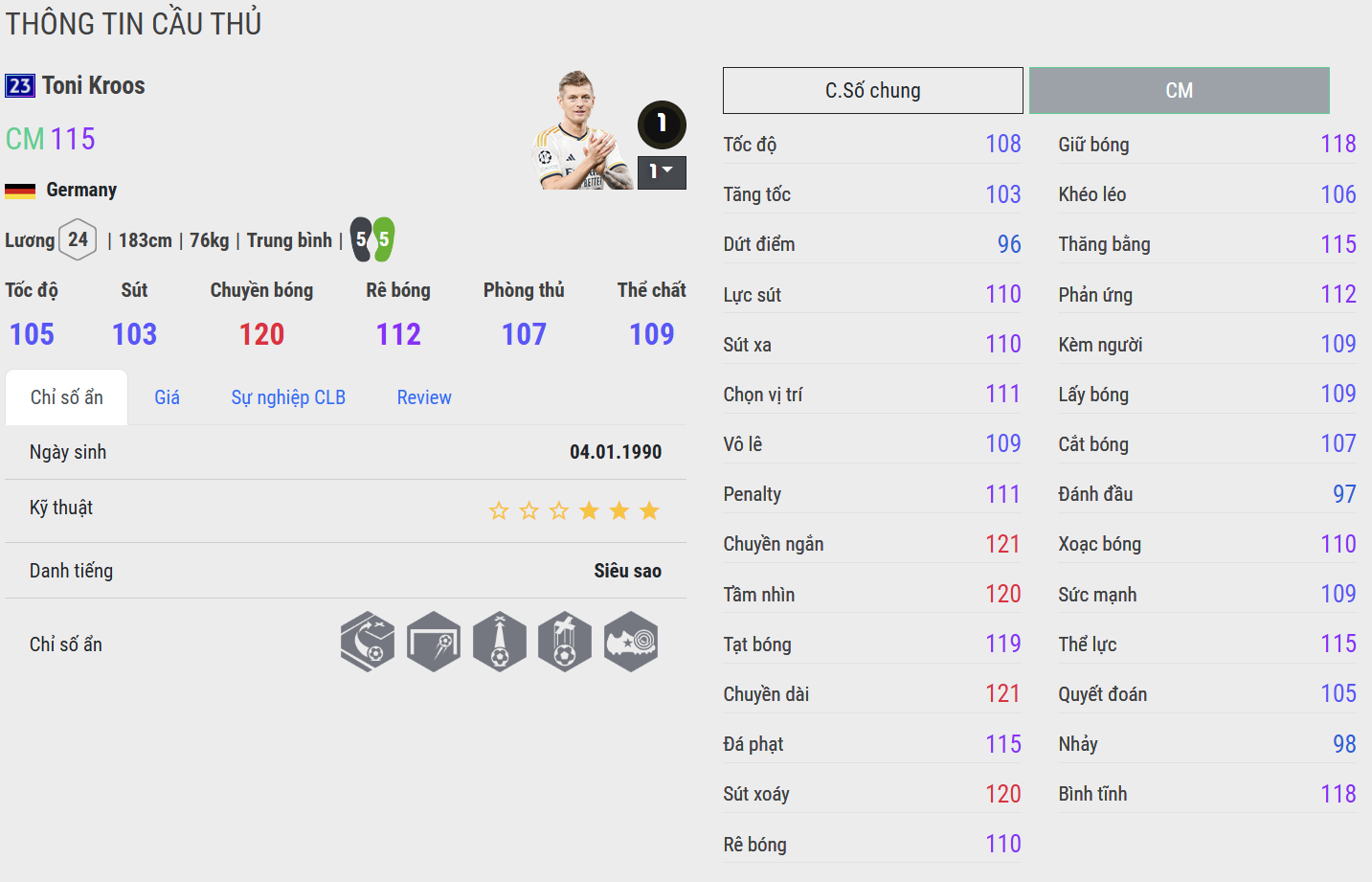 Toni Kroos trong FC Online là hiện thân của sự điềm tĩnh và chuẩn xác – mẫu tiền vệ điều phối mang đậm tính chiến thuật, nơi mỗi đường chuyền đều mang giá trị định hình lối chơi. Kroos nổi bật với khả năng chuyền bóng ở đẳng cấp cao.