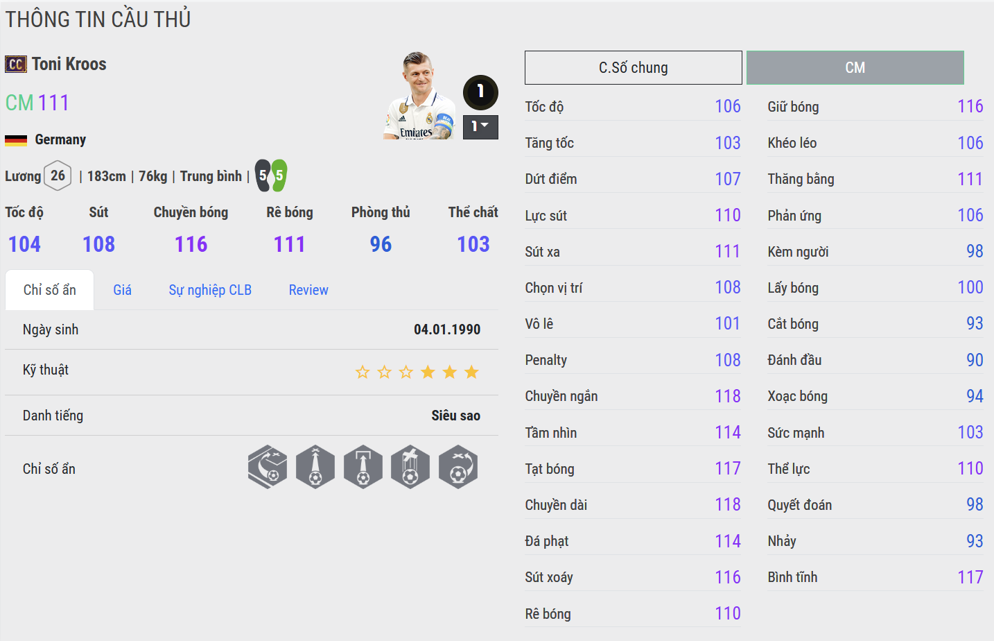 Kroos FAC là phiên bản toàn diện hơn khi cải thiện cả khả năng chuyền bóng lẫn dứt điểm. Anh có thể vừa điều tiết trận đấu, vừa tung ra những cú sút xa uy lực tạo đột biến. Trong thực chiến, đây là phiên bản rất đáng tin cậy ở tuyến giữa.