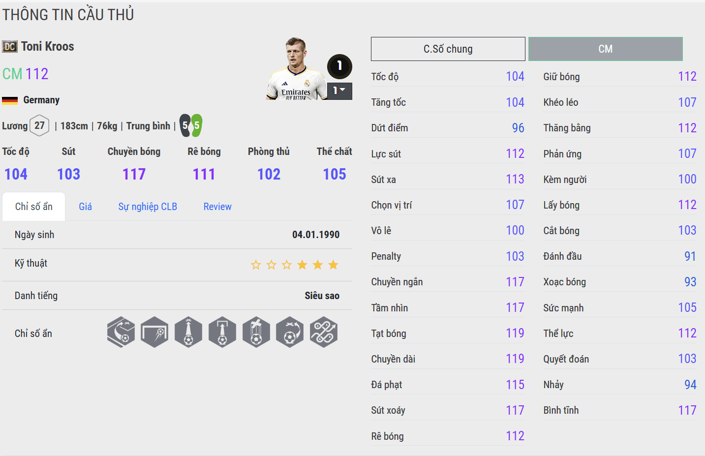 Phiên bản 23UCL mang đến một Kroos chơi ổn định với khả năng chuyền bóng tốt và giữ nhịp khá an toàn. Anh vẫn có thể tung ra những đường chuyền chính xác, nhưng tốc độ xử lý và độ “mượt” trong thực chiến chưa thật sự nổi bật.