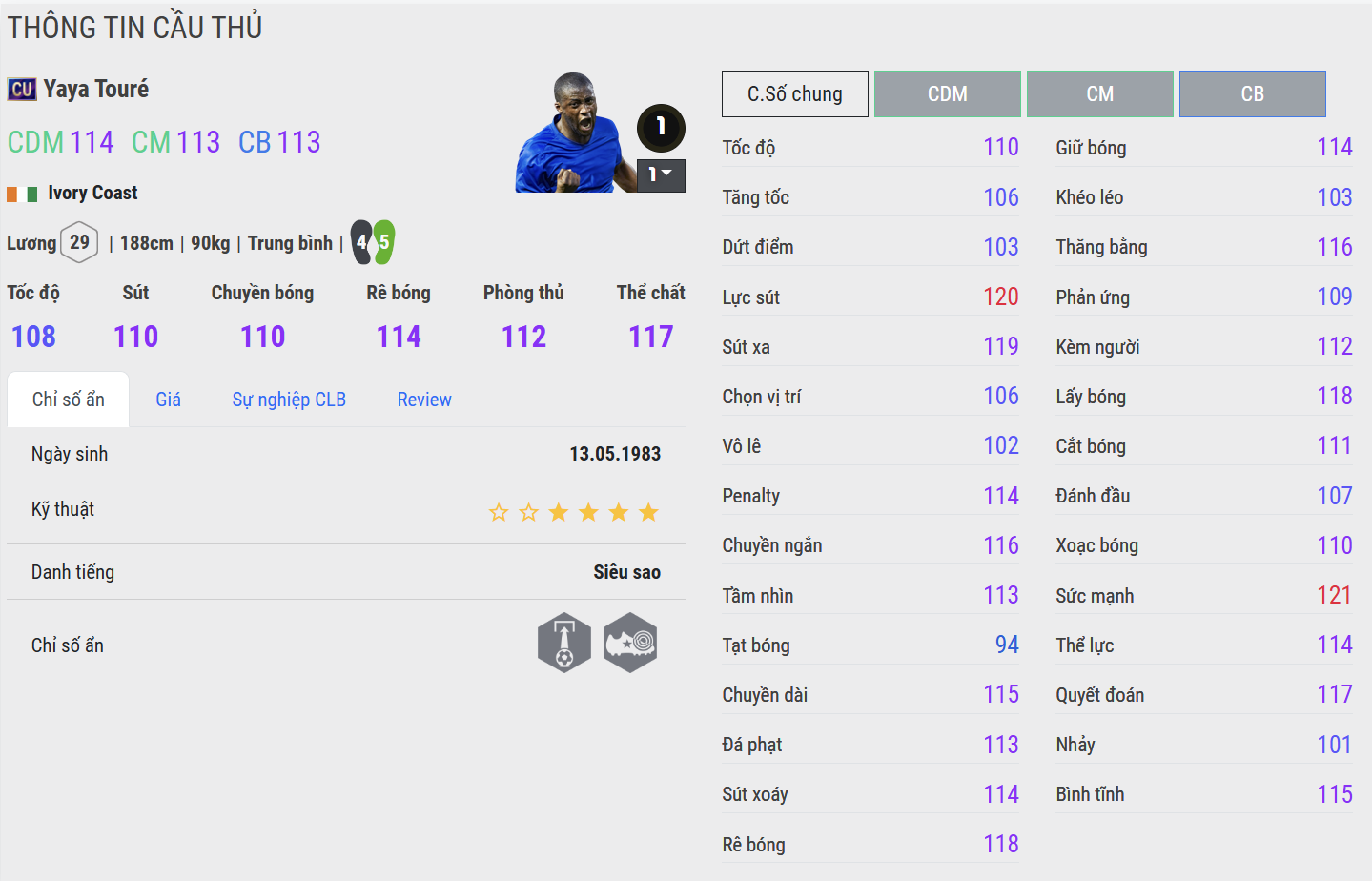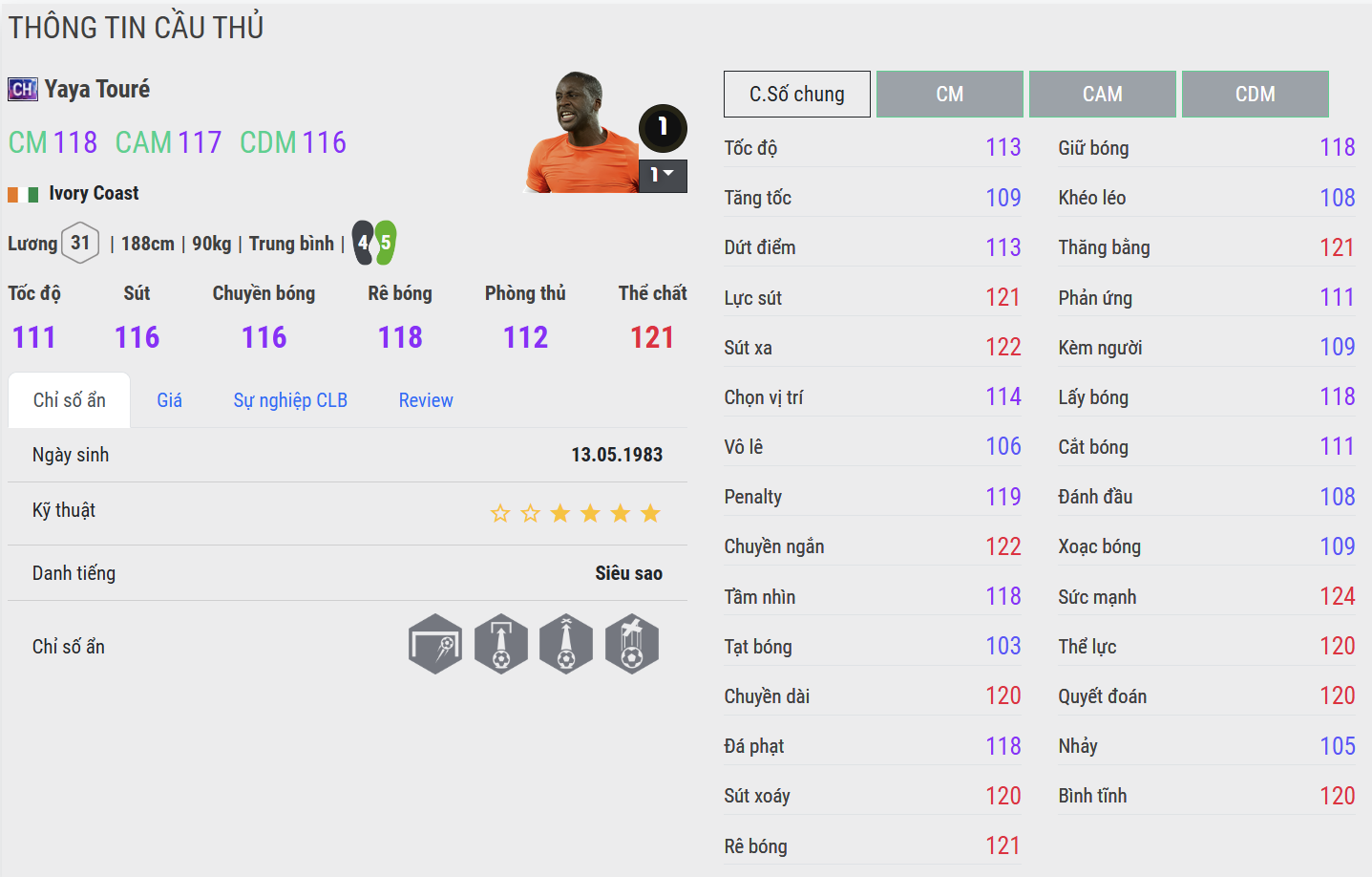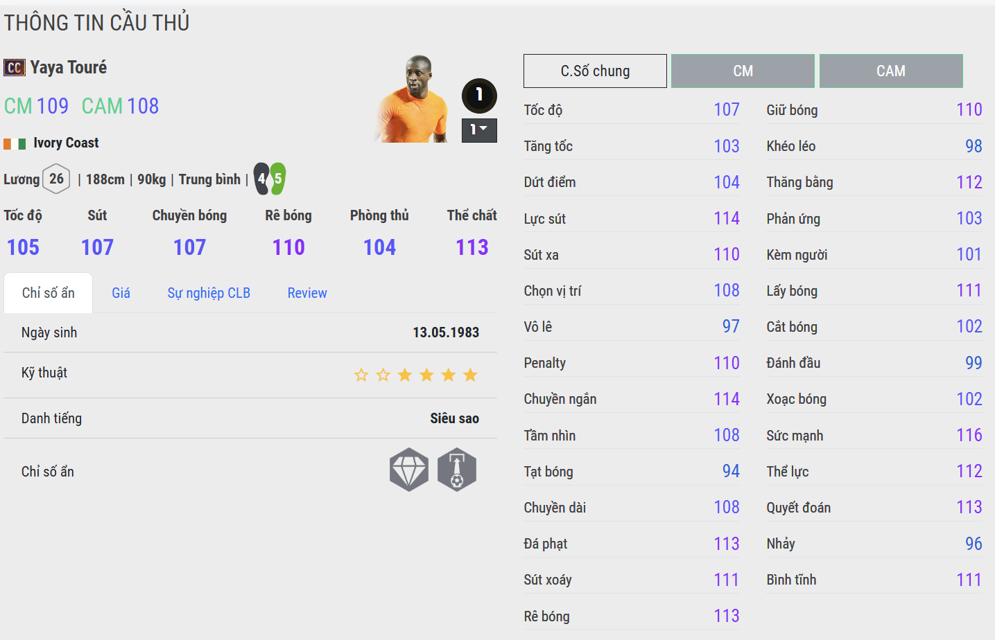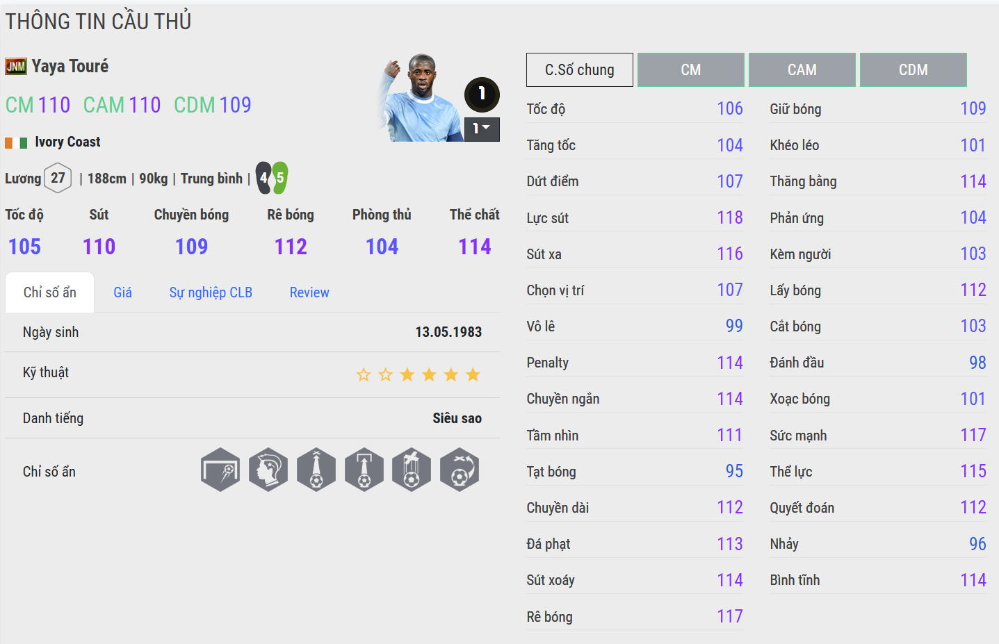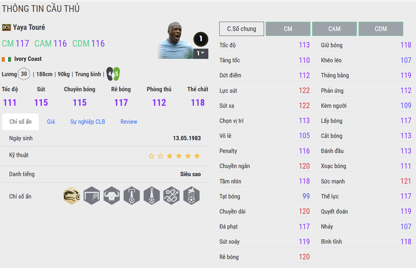 Toure CU là phiên bản toàn diện và hiệu quả nhất của Yaya Toure trong game. Bộ chỉ số vượt trội giúp anh vừa mạnh mẽ trong tranh chấp, vừa xử lý bóng mượt mà khi cầm bóng ở tuyến giữa. Khả năng chuyền bóng chính xác, di chuyển thông minh và những cú sút xa uy lực giúp Toure CU trở thành trung tâm của tuyến giữa, mang lại sự cân bằng hoàn hảo giữa phòng ngự và tấn công cho đội hình.