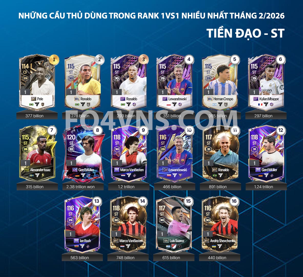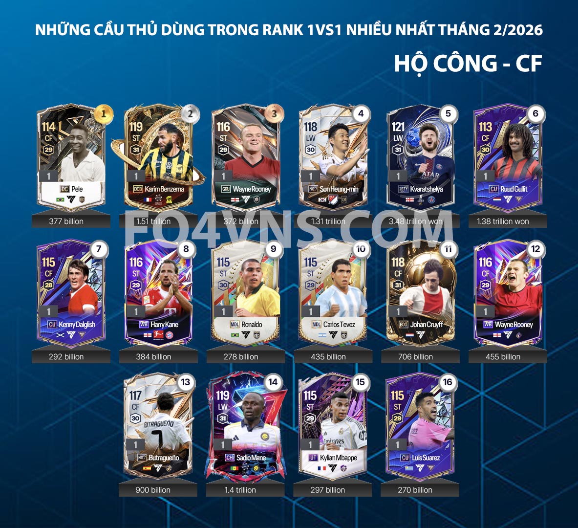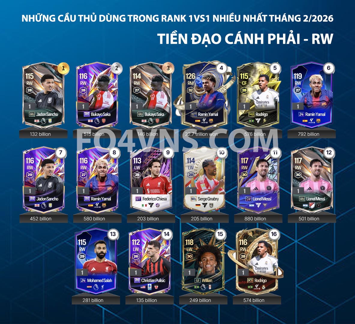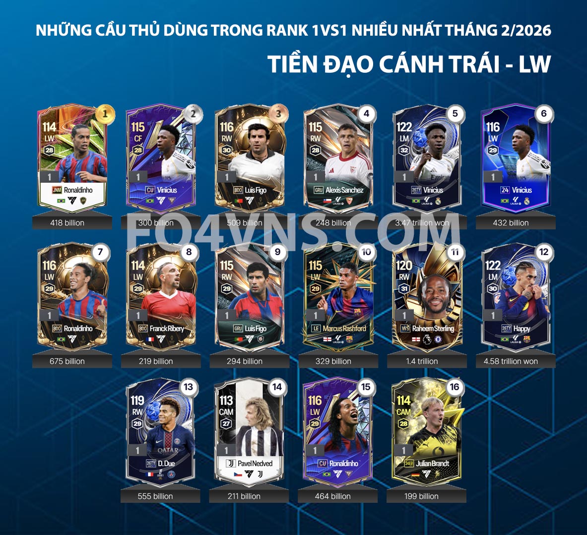 LW (Left Winger) và RW (Right Winger) là hai tiền đạo cánh, hoạt động ở hành lang biên. Họ sử dụng tốc độ và kỹ thuật để vượt qua hậu vệ, thực hiện tạt bóng hoặc cắt vào trung lộ dứt điểm. Ở meta hiện tại, các cầu thủ chạy cánh có khả năng sút xa và bứt tốc tốt thường rất hiệu quả trong phản công nhanh. Sự kết hợp hài hòa giữa ST, CF và hai cánh LW – RW sẽ tạo nên hệ thống tấn công đa dạng, linh hoạt và khó đoán trong FC Online.