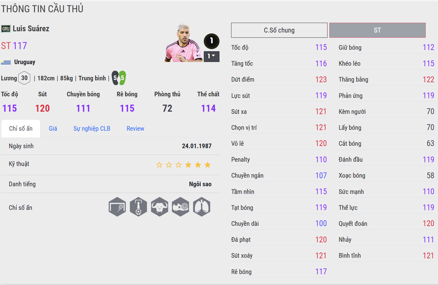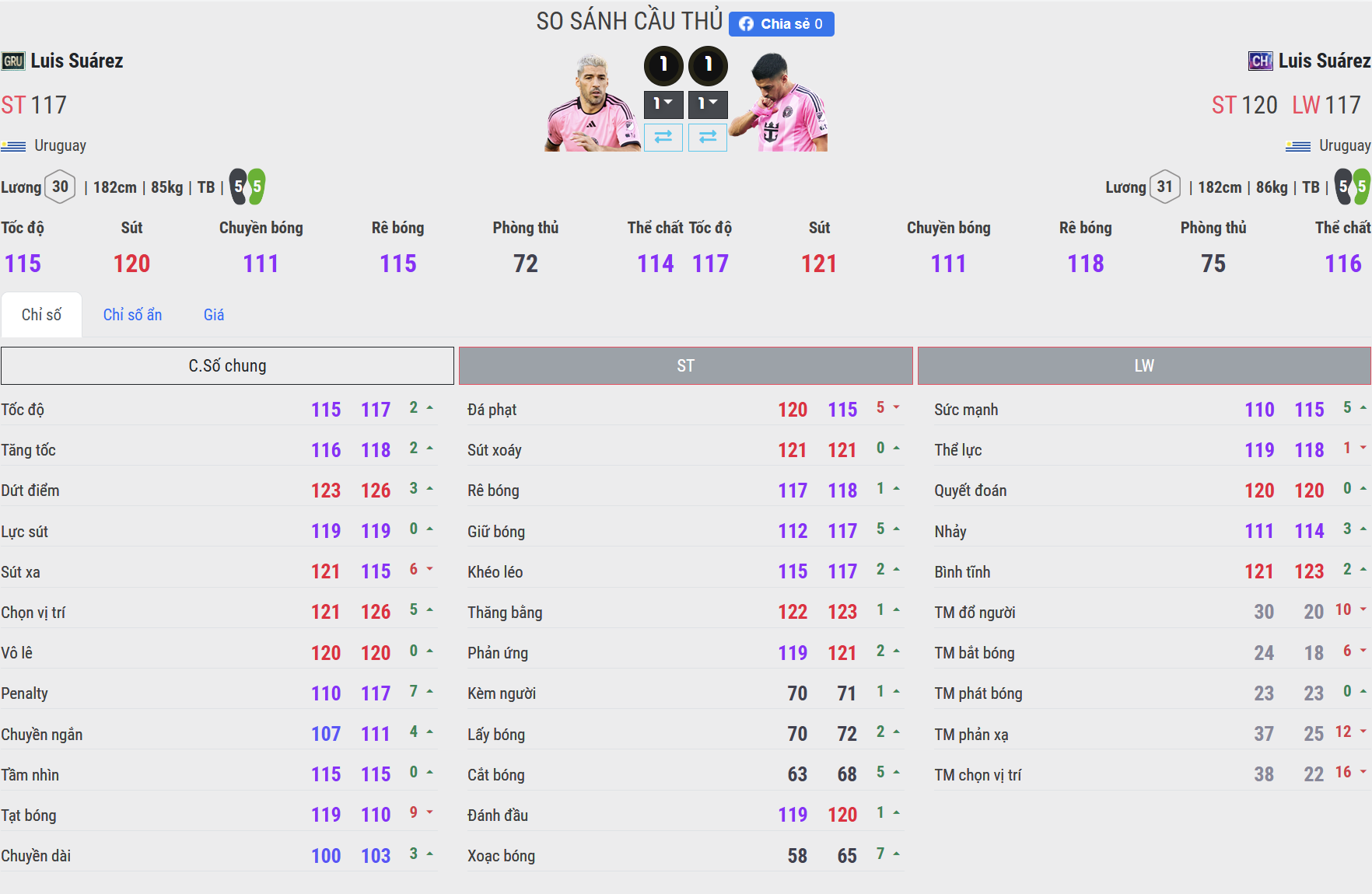 Ở mùa CH, Suárez được cải thiện rõ rệt về tốc độ bứt phá, khả năng tăng tốc nhanh và duy trì tốc độ ổn định trong các pha đua tốc. Điều này giúp anh linh hoạt hơn khi di chuyển rộng, kéo giãn hàng thủ và khai thác khoảng trống phía sau lưng hậu vệ. Trong khi đó, phiên bản GRU vẫn giữ được nét đặc trưng “tiền đạo săn bàn cổ điển” – tốc độ không quá nổi bật, chủ yếu hiệu quả trong những pha di chuyển ngắn và chọn vị trí khôn ngoan thay vì đua tốc đường dài.