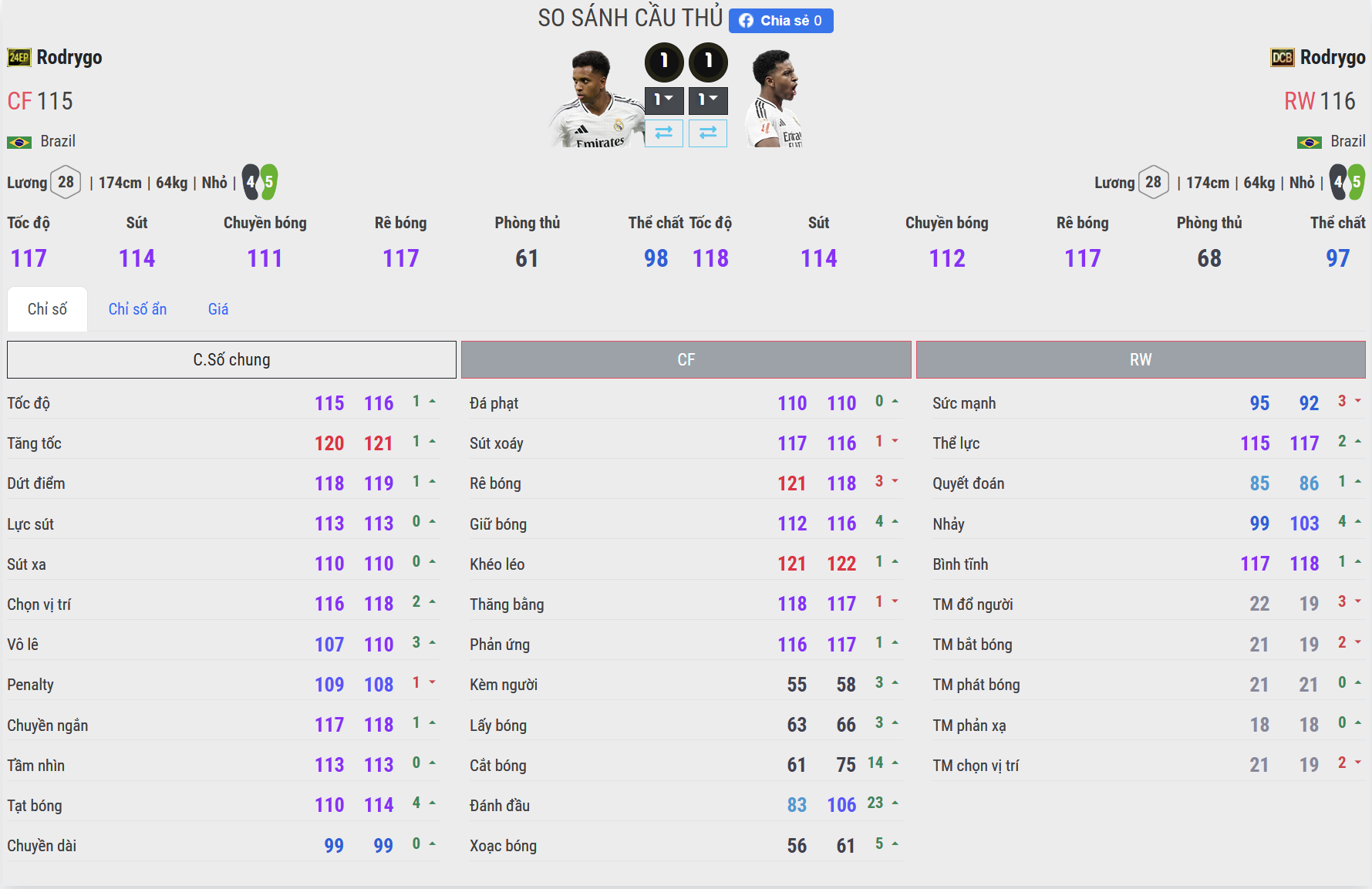 Rodrygo DCB là phiên bản nhanh và thanh thoát nhất của cầu thủ người Brazil tính đến hiện tại. Cảm giác bứt tốc cực nhạy, chạy đà mượt và tăng tốc đột ngột khiến hậu vệ đối phương rất khó đuổi kịp. Khi thoát pressing hoặc dốc bóng biên, DCB tạo cảm giác “bay” với từng nhịp chạm bóng. Trong khi đó, 24EP vẫn giữ tốc độ cao nhưng hơi “thật” hơn, tức là ít hiệu ứng lướt và chuyển hướng chưa linh hoạt bằng. Ở lối chơi phản công nhanh hoặc kéo biên, DCB chiếm ưu thế rõ rệt.