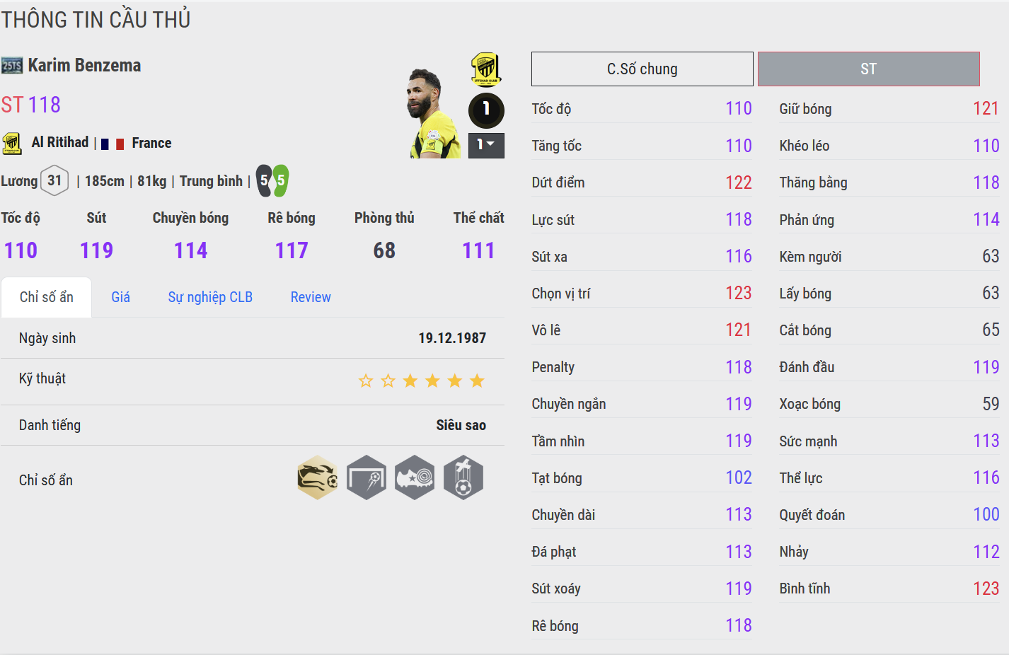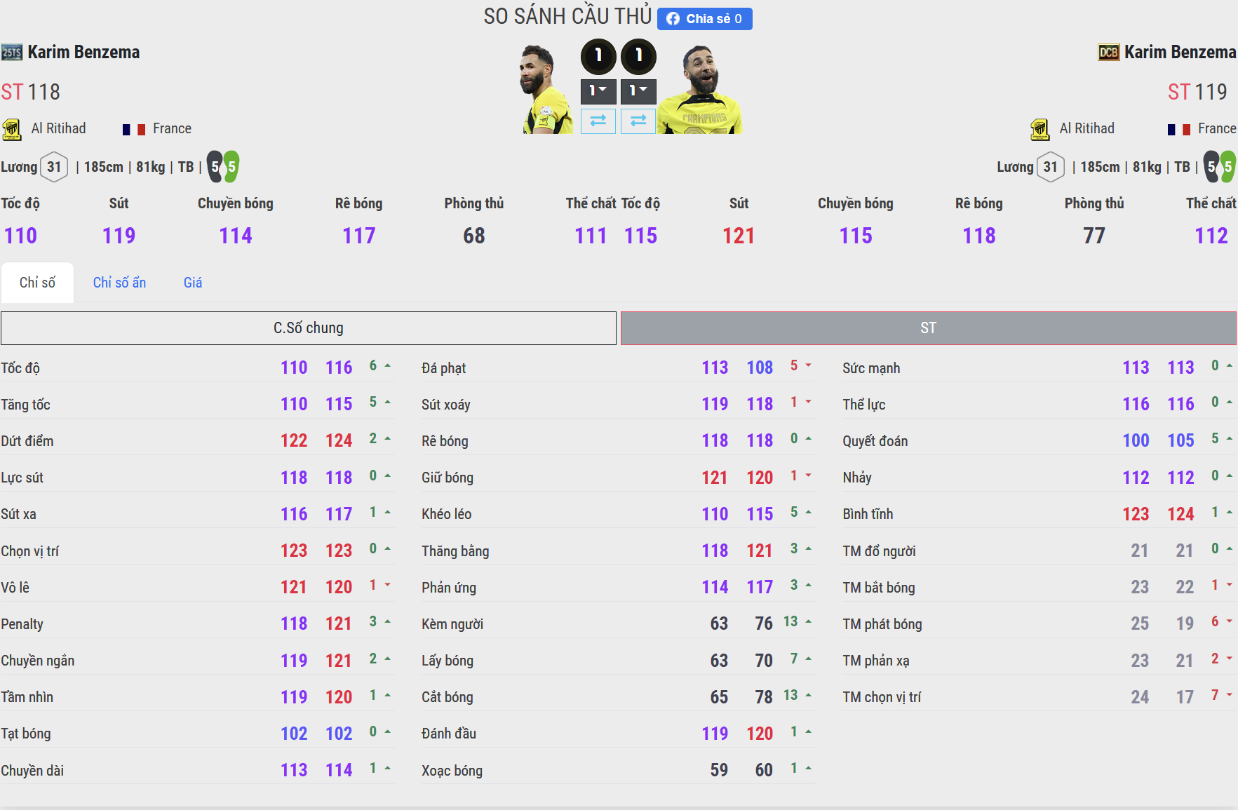Benzema mùa 25TS có tốc độ vừa phải, không quá nổi bật nhưng đủ để xoay trở và thoát pressing trong phạm vi ngắn. Anh thiên về di chuyển thông minh hơn là bứt tốc thuần túy. Trong khi đó, mùa DCB lại cải thiện rõ rệt về tốc độ, đặc biệt là bước chạy đầu tiên nhanh và khả năng tăng tốc đường dài ổn định hơn. Điều này giúp Benzema DCB có thể tự tin bứt lên trong các tình huống phản công hoặc thoát kèm khi đối đầu với trung vệ nhanh. Nếu 25TS phù hợp lối chơi chậm rãi, phối hợp nhóm thì DCB lại đa dụng hơn trong cả tấn công nhanh lẫn kiểm soát bóng.