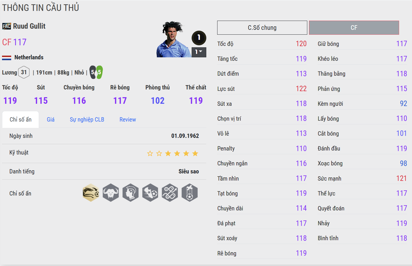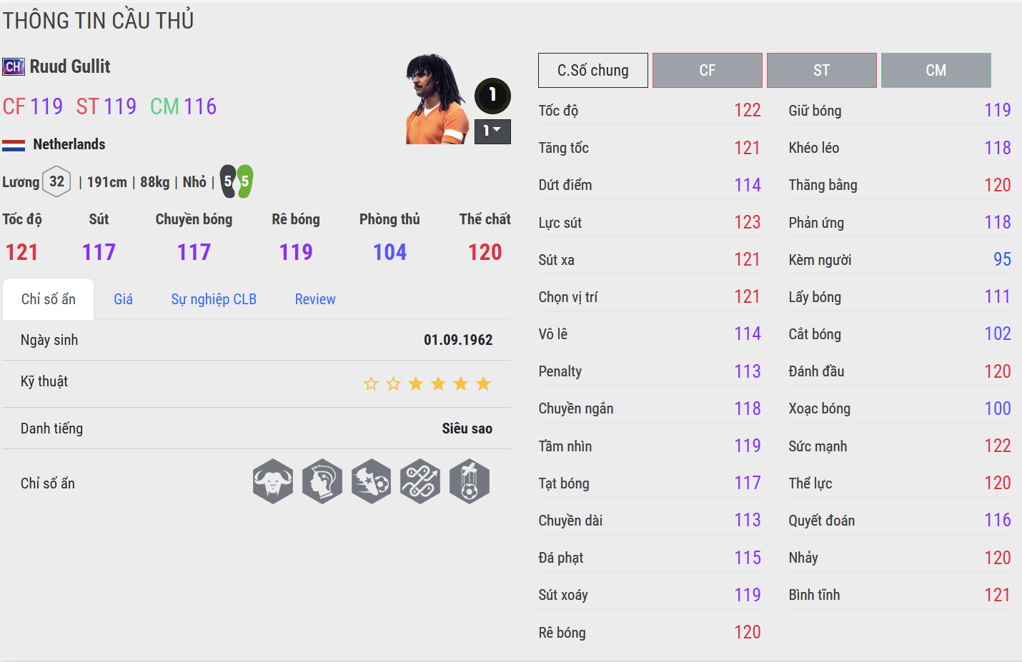 Ruud Gullit là một trong những biểu tượng toàn diện nhất của bóng đá Hà Lan và thế giới. Sở hữu thể hình lý tưởng, mái tóc dreadlocks đặc trưng cùng phong thái thủ lĩnh mạnh mẽ, Gullit nổi bật nhờ khả năng chơi bóng đa năng hiếm có.