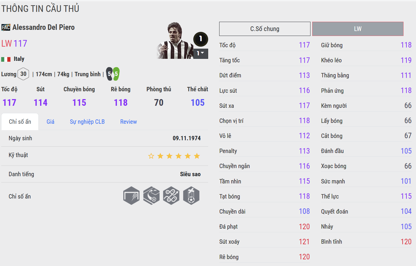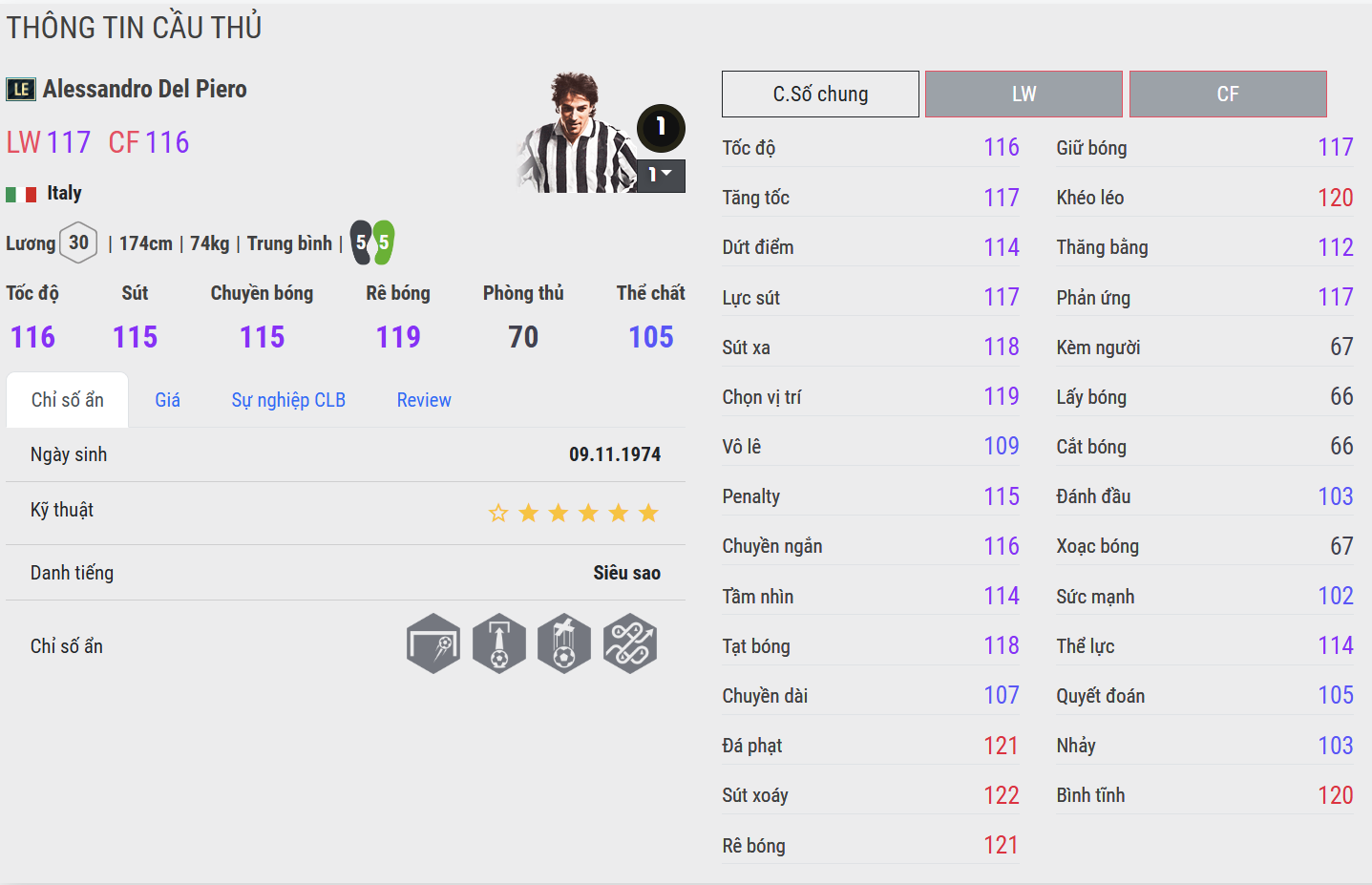 Del Piero vốn không phải mẫu cầu thủ chơi va chạm. Ở mùa FAC, khi bị trung vệ áp sát từ phía sau, khả năng giữ bóng khá mong manh. Những tình huống quay lưng khung thành dễ bị đẩy bật ra. LE cải thiện khả năng giữ thăng bằng và chịu va chạm ở mức vừa phải. Không thể gọi là “trâu”, nhưng đủ để xoay người dứt điểm hoặc nhả bóng khi bị kèm rát. Trong meta hiện tại, đây là khác biệt khá quan trọng.