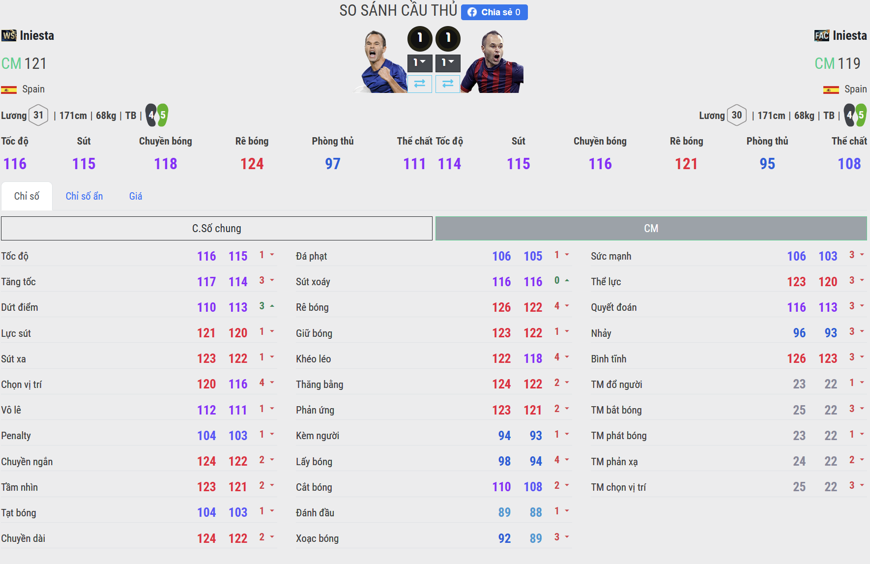 Iniesta FAC có tốc độ ở mức khá. Khả năng tăng tốc đoạn ngắn tốt giúp anh thoát pressing và xâm nhập khoảng trống hiệu quả hơn trong lối chơi hiện đại. Iniesta WS chậm hơn một nhịp. Tuy nhiên, nhịp chạy mượt, chọn vị trí thông minh giúp WS luôn có mặt đúng điểm rơi, bù đắp cho hạn chế tốc độ thuần.