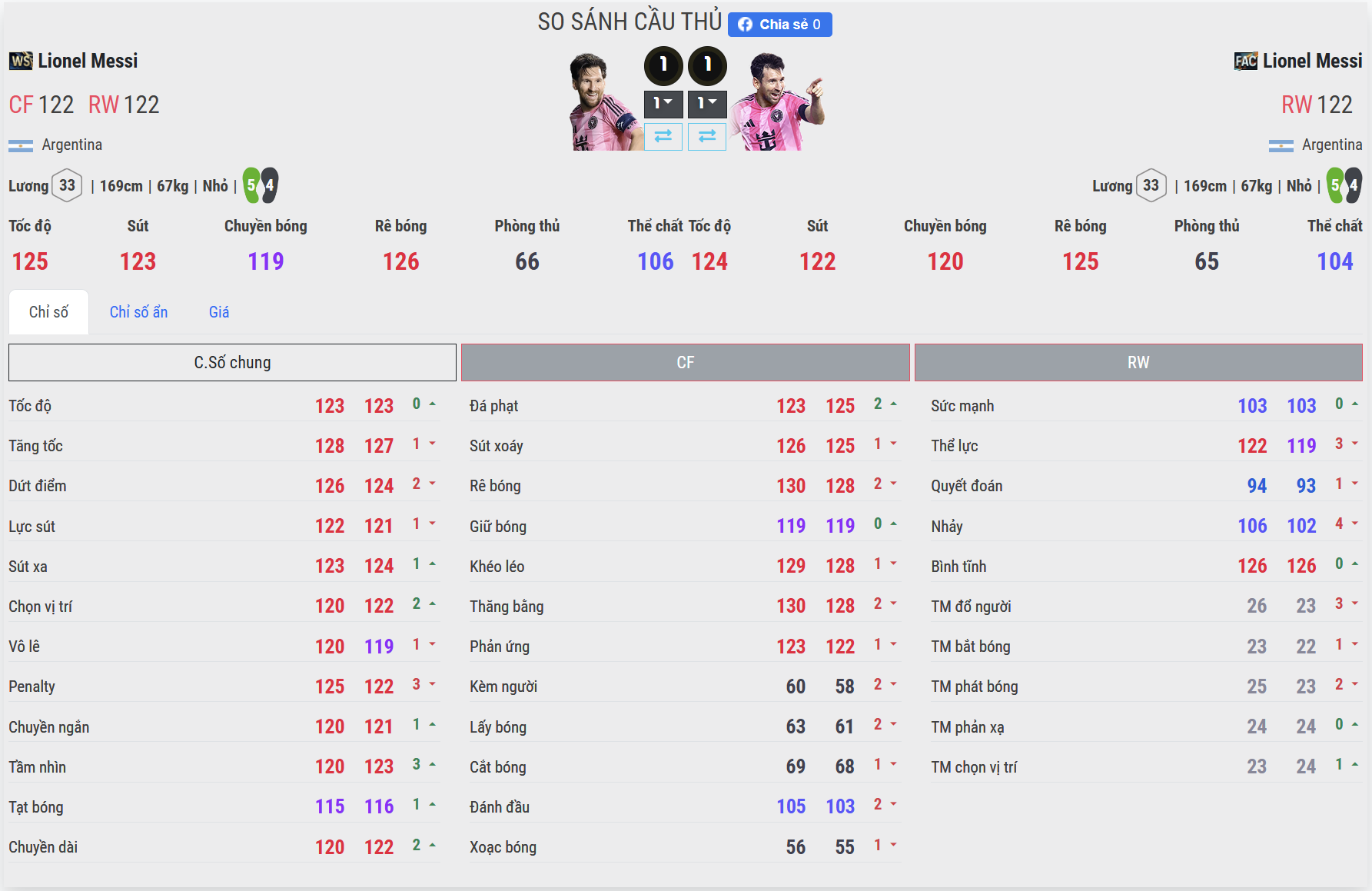 Messi FAC có gia tốc và tốc độ nước đầu rất ấn tượng. Những pha bứt tốc ngắn, đổi hướng và tăng tốc sau khi nhận bóng cho cảm giác liền mạch, rất phù hợp với lối chơi phản xạ nhanh và pressing tầm cao. Messi WS không chậm, nhưng cảm giác tăng tốc mềm hơn, thiên về kiểm soát bóng thay vì bùng nổ. WS phù hợp với lối chơi giữ bóng, rê dắt và chọn thời điểm bứt phá.