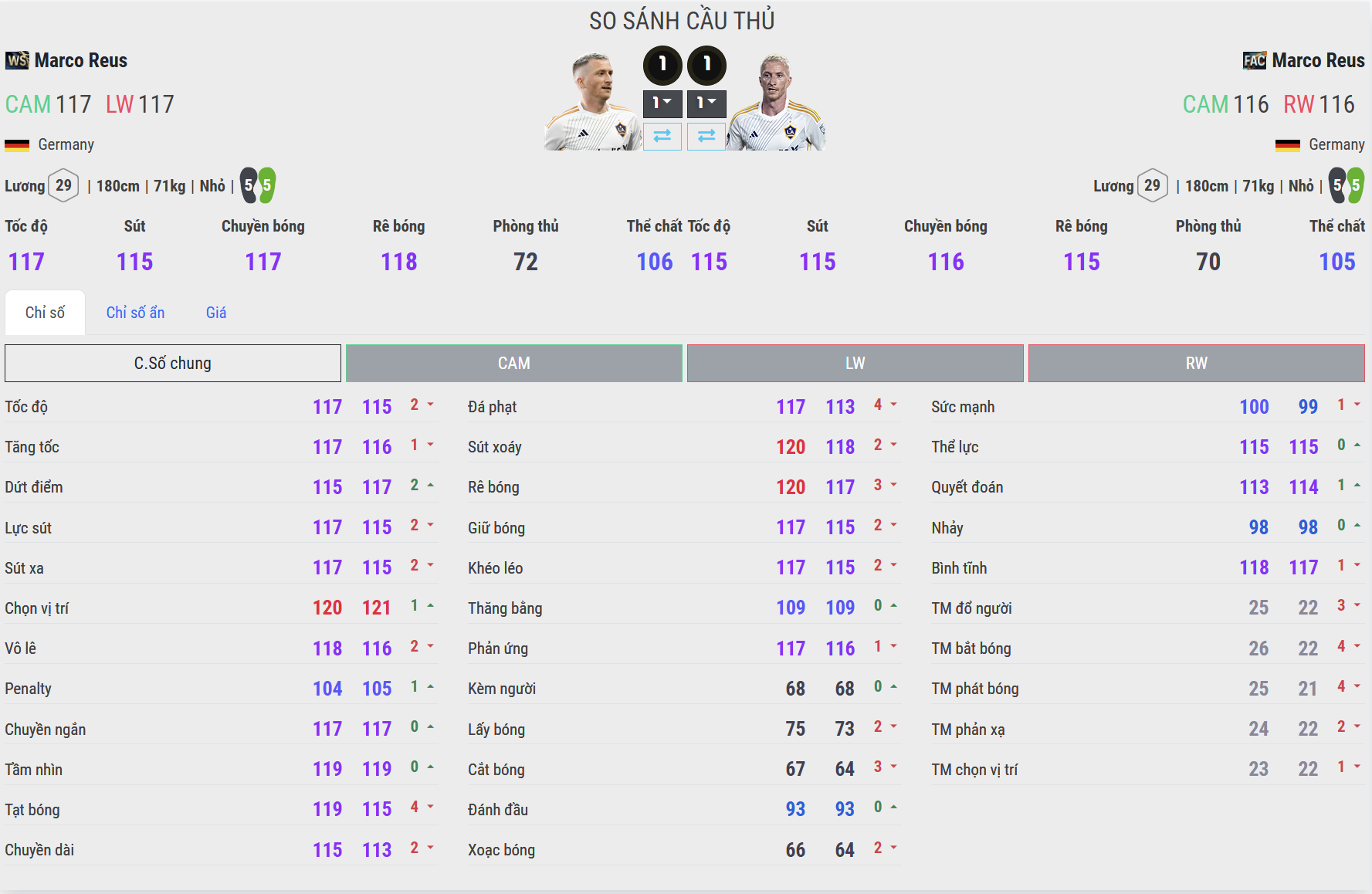 WS bứt tốc và chuyển hướng nhanh hơn, FAC giữ nhịp ổn định hơn. FAC cho cảm giác Reus di chuyển khá mượt ở nhịp trung bình. Anh không quá nhanh nhưng đủ để thoát khỏi sự đeo bám trong phạm vi hẹp, phù hợp với lối đá kiểm soát. WS cải thiện rõ độ tăng tốc ban đầu và khả năng đổi hướng ở tốc độ cao. Những pha kéo bóng phản công hoặc băng cắt sau lưng hàng thủ sắc hơn FAC. Nếu bạn chơi thiên về chuyển trạng thái nhanh, WS mang lại hiệu quả rõ rệt hơn.