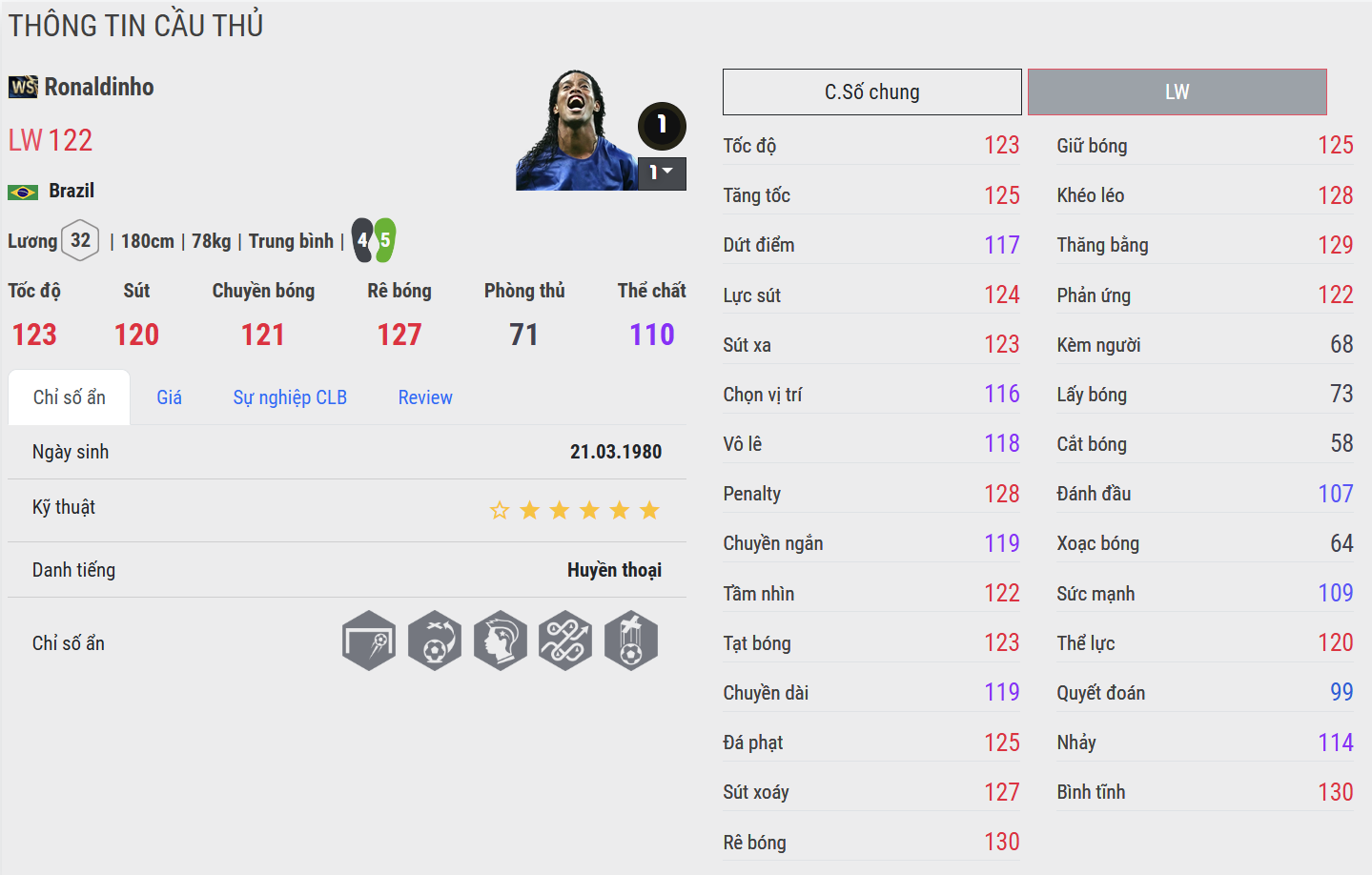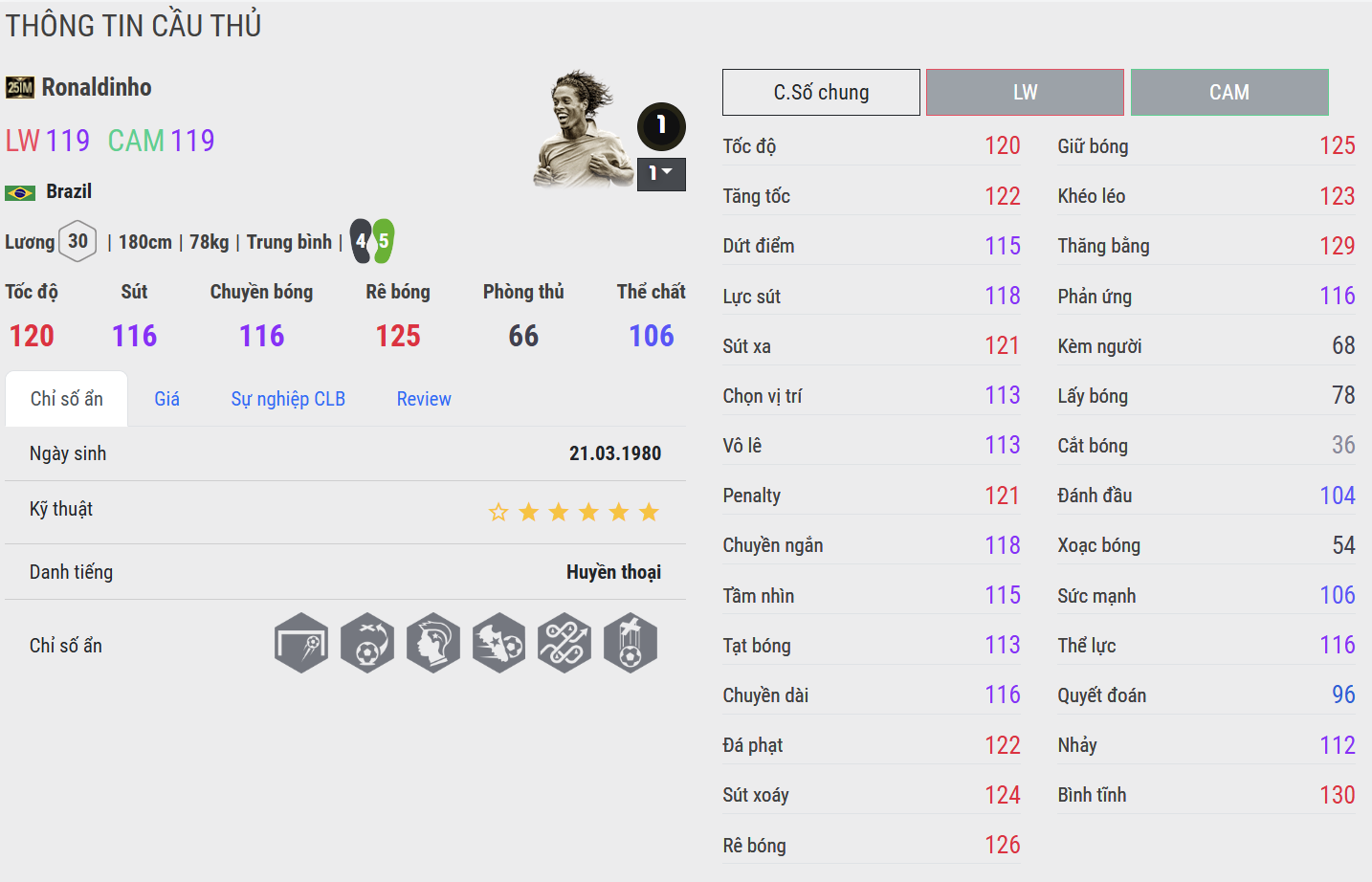 Anh là hiện thân của thứ bóng đá đẹp – tự do, sáng tạo và đầy cảm xúc. Trong FC Online, Ronaldinho là biểu tượng của sự ngẫu hứng đỉnh cao, nơi kỹ thuật, tầm nhìn và bản năng tấn công hòa quyện, mang đến những khoảnh khắc khiến đối thủ chỉ biết đứng nhìn trong thán phục.