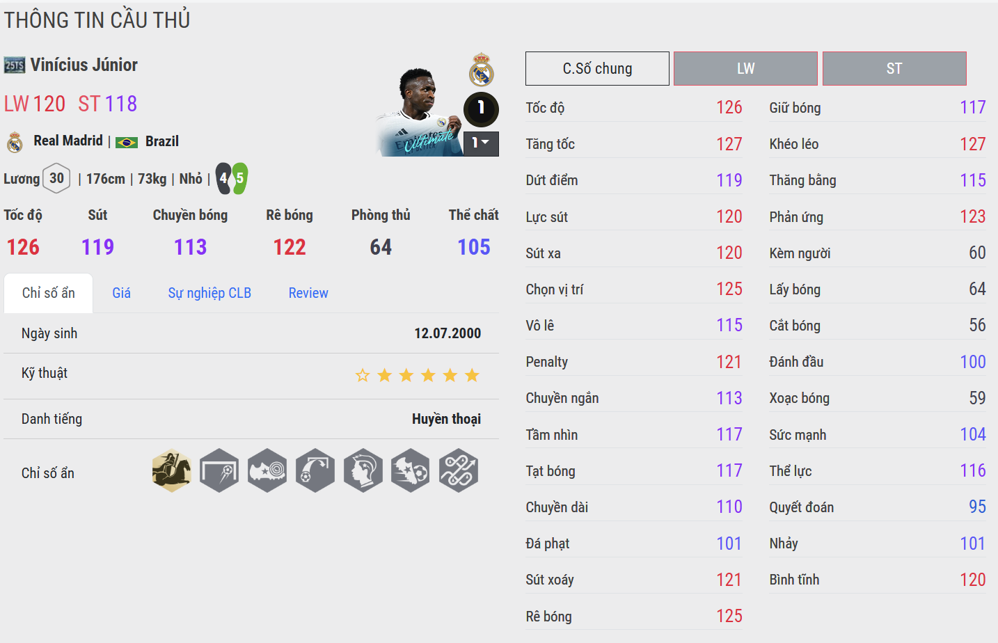 Vinicius Junior là hiện thân của thứ bóng đá bùng nổ, trẻ trung và ngập tràn năng lượng – một mũi công mà chỉ cần chạm bóng thôi cũng đủ khiến đối thủ phải giật mình. Xuất thân từ l lò đào tạo Brazil đầy tính nghệ sĩ, anh mang theo sự ngẫu hứng, tốc độ và khả năng tạo đột biến mà rất ít cầu thủ cùng thế hệ có được.