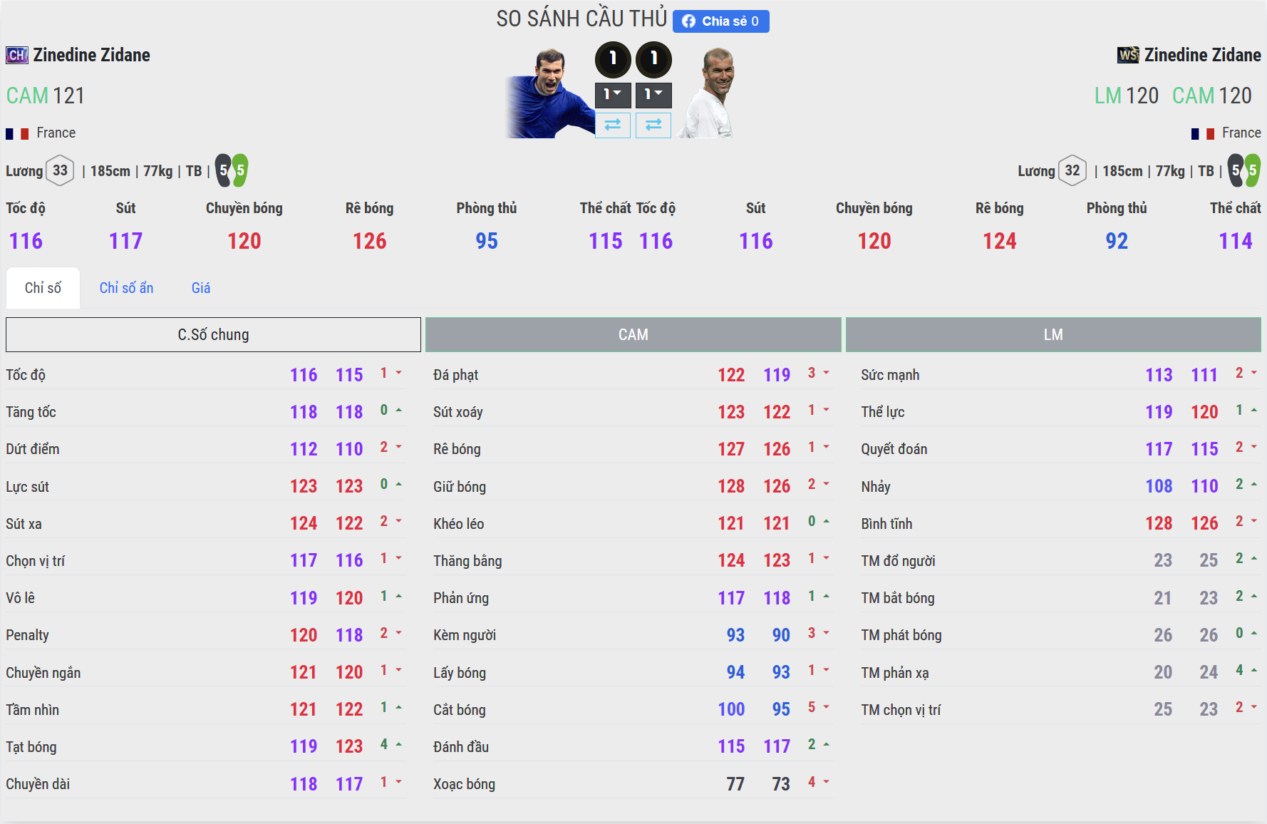 → Nhận xét: WS Zidane vẫn là lựa chọn hàng đầu cho lối chơi nghệ thuật, CH thiên về tính hiệu quả và tốc độ hơn.