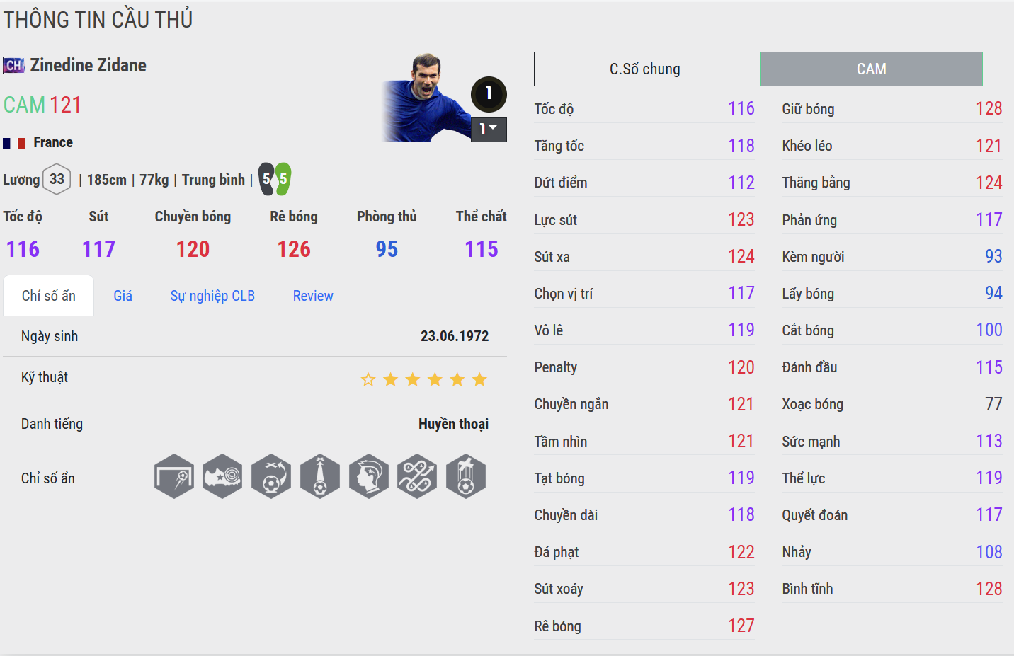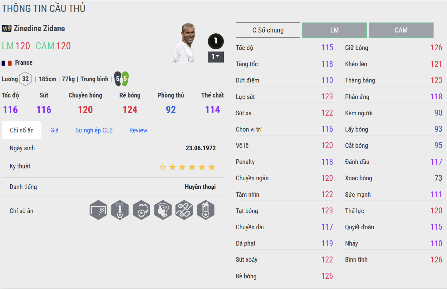CH: Chỉ số tì đè nhỉnh hơn WS, giúp Zidane chống chịu tốt hơn trước các pha pressing quyết liệt. Giữ bóng chắc hơn trong những pha tranh chấp giữa sân.