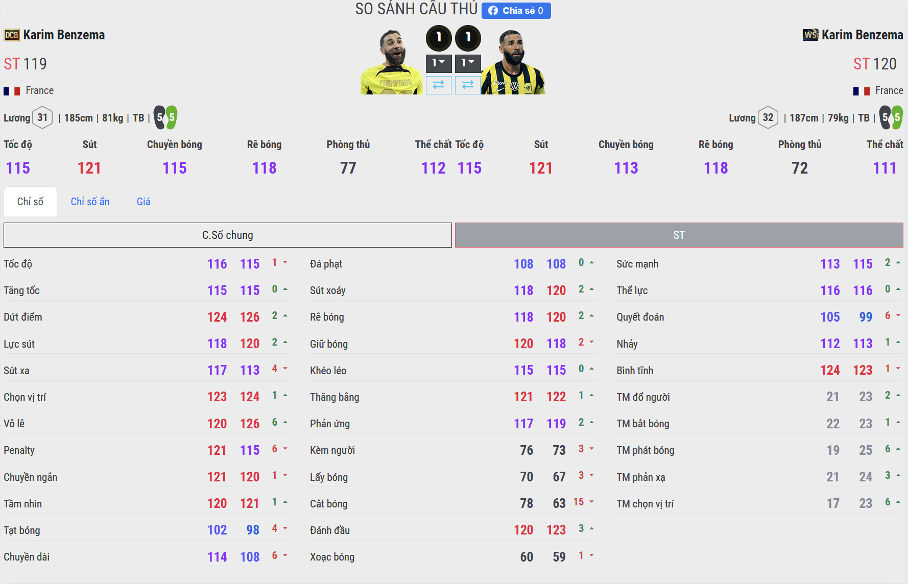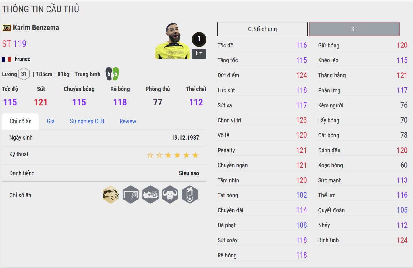 DCB: Chỉ số tì đè nhỉnh hơn, giúp Benzema giữ bóng tốt hơn khi bị pressing, đặc biệt hữu ích trong các pha cầm bóng chờ đồng đội hỗ trợ.