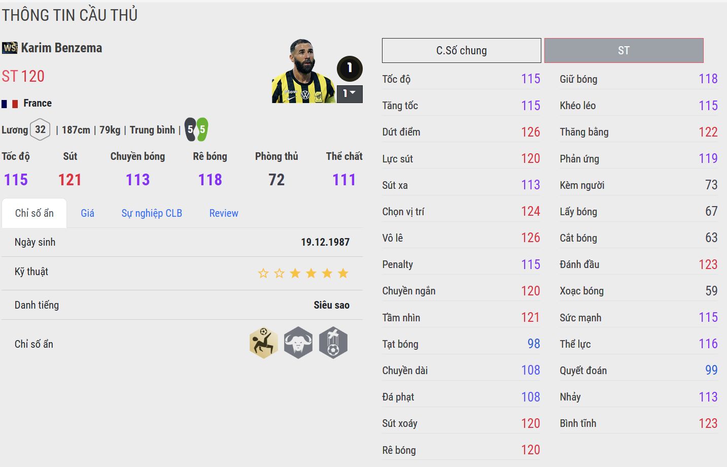 WS: Tốc độ khá ổn, giúp Benzema di chuyển linh hoạt giữa các trung vệ đối phương. Phù hợp cho những pha chạy chỗ cắt bóng hoặc phản công nhanh, nhưng không phải tiền đạo thiên về tốc độ vượt trội.