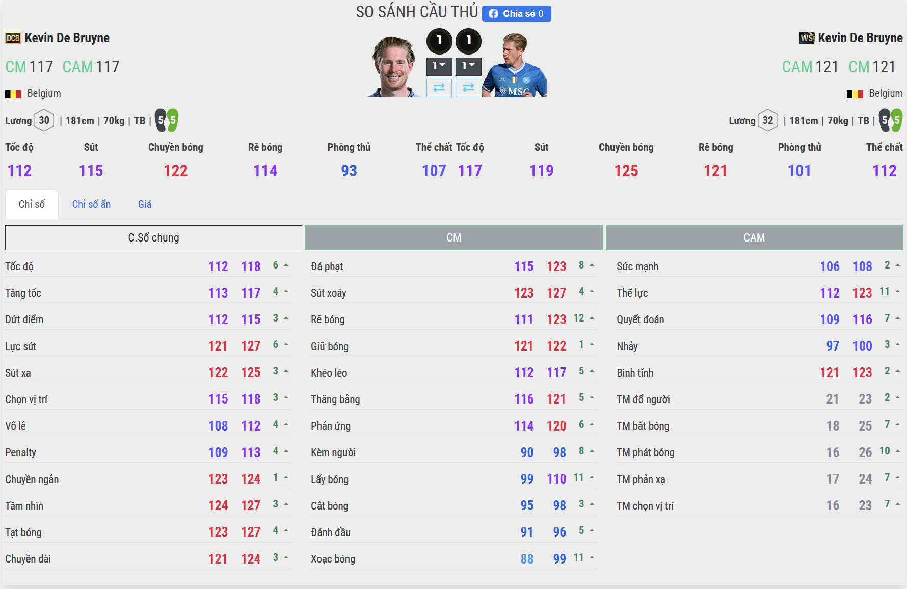 De Bruyne chưa bao giờ nổi bật ở khả năng bứt tốc, nhưng mùa WS đã cải thiện rõ rệt về tốc độ di chuyển và khả năng thoát pressing. Cảm giác di chuyển linh hoạt, nhịp chuyển hướng nhanh và tăng tốc tốt hơn giúp anh có thể tham gia nhiều hơn vào những pha phản công hoặc đột nhập vòng cấm. Trong khi đó, mùa DCB có phần chậm rãi hơn, thiên về điều tiết và giữ vị trí hơn là tạo đột biến bằng tốc độ. Ở những tình huống dâng cao, WS cho cảm giác nhịp nhàng và “mượt” hơn trong từng bước chạy.