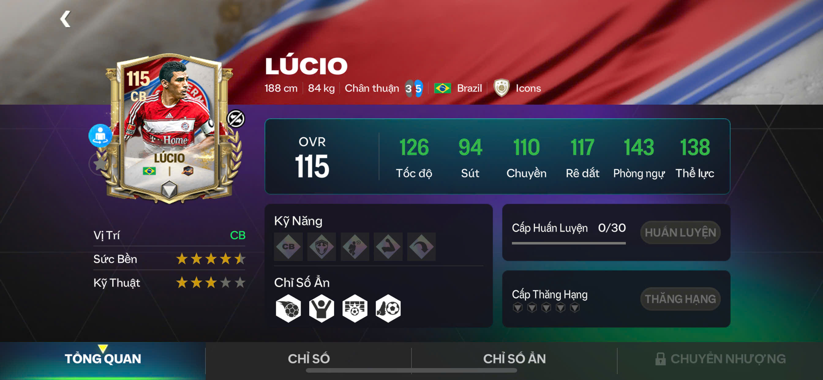 Lúcio là biểu tượng của hàng thủ thép Bayern — mạnh mẽ, cứng rắn và đầy uy lực trong mọi pha va chạm. Khả năng tì đè, xoạc bóng và đọc tình huống của anh đạt mức gần như hoàn hảo, biến mọi cuộc đối đầu 1v1 thành lợi thế cho Bayern. Không chỉ phòng ngự chủ động, Lúcio còn sở hữu khả năng phát triển bóng ổn định, tạo nền tảng để đội hình triển khai nhịp nhàng. Đây là trung vệ đại diện rõ nhất cho tinh thần “cơ học nhưng không khô cứng” của Bayern thời hoàng kim.