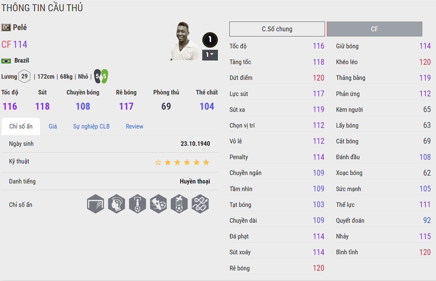 Đứng đầu bảng xếp hạng là Pelé DC – huyền thoại vĩ đại với phong cách chơi toàn diện, đậm chất nghệ thuật nhưng vẫn vô cùng hiệu quả. Anh có thể rê bóng, dứt điểm, chuyền, thậm chí băng cắt như một “ảo thuật gia sân cỏ”. Trong FC Online, Pelé DC là mẫu tiền đạo biết cách tạo khác biệt ở mọi pha xử lý, luôn biết xuất hiện đúng lúc để mang về bàn thắng quyết định.