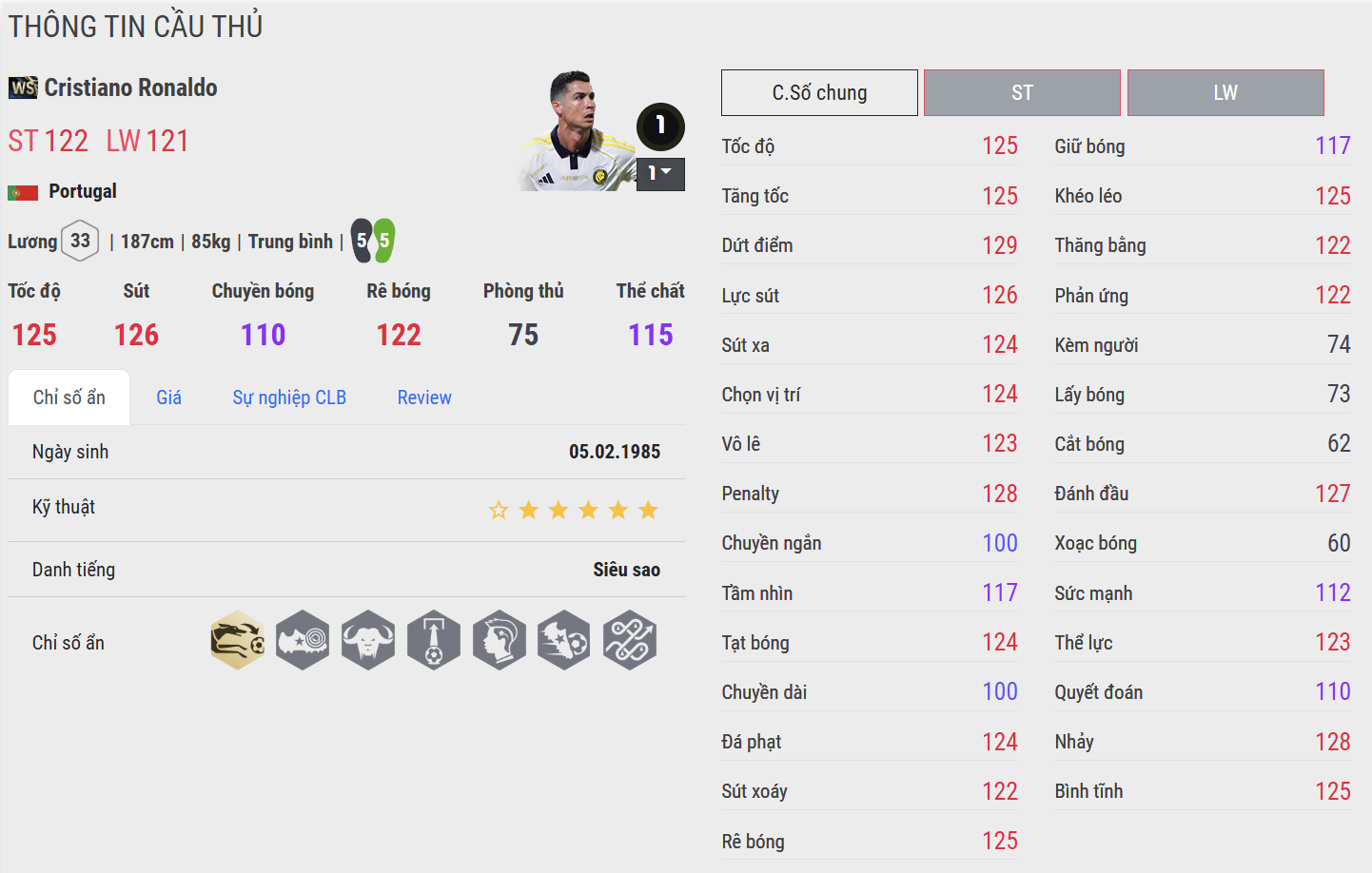 Cristiano Ronaldo WS kết hợp hoàn hảo giữa tốc độ, thể hình và khả năng chọn vị trí. Anh đặc biệt nguy hiểm trong các tình huống tạt bóng khi có thể băng cắt đánh đầu hoặc dứt điểm một chạm cực kỳ hiệu quả.