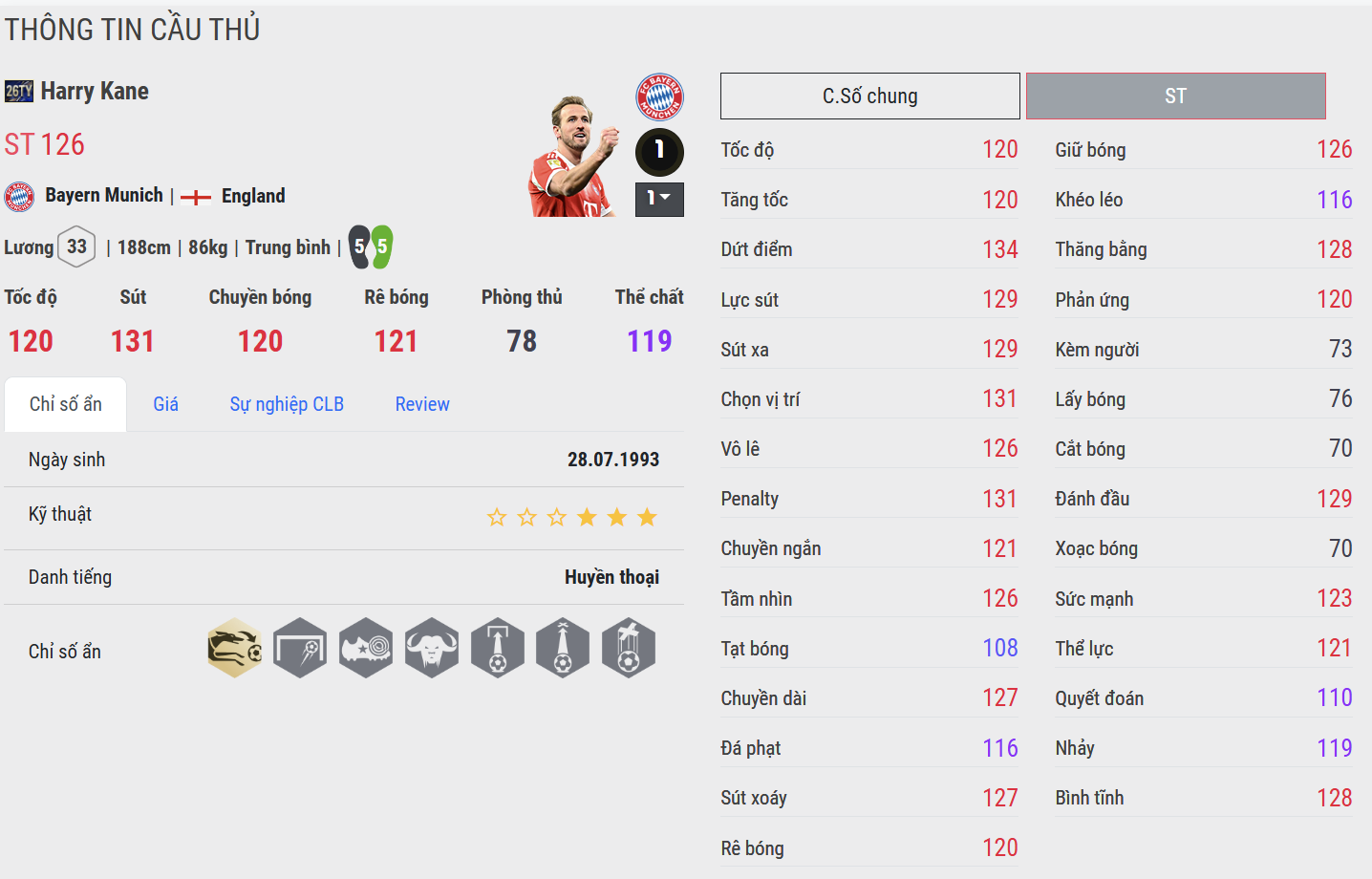 Harry Kane 26TY là lựa chọn hoàn hảo nhất cho chỉ số ẩn này. Khả năng di chuyển, chọn vị trí và dứt điểm của Kane đạt đến mức tối ưu. Trong thực chiến, anh luôn biết cách xuất hiện đúng lúc, tung ra những cú chạm bóng quyết định và mang lại hiệu suất ghi bàn cực kỳ ổn định.