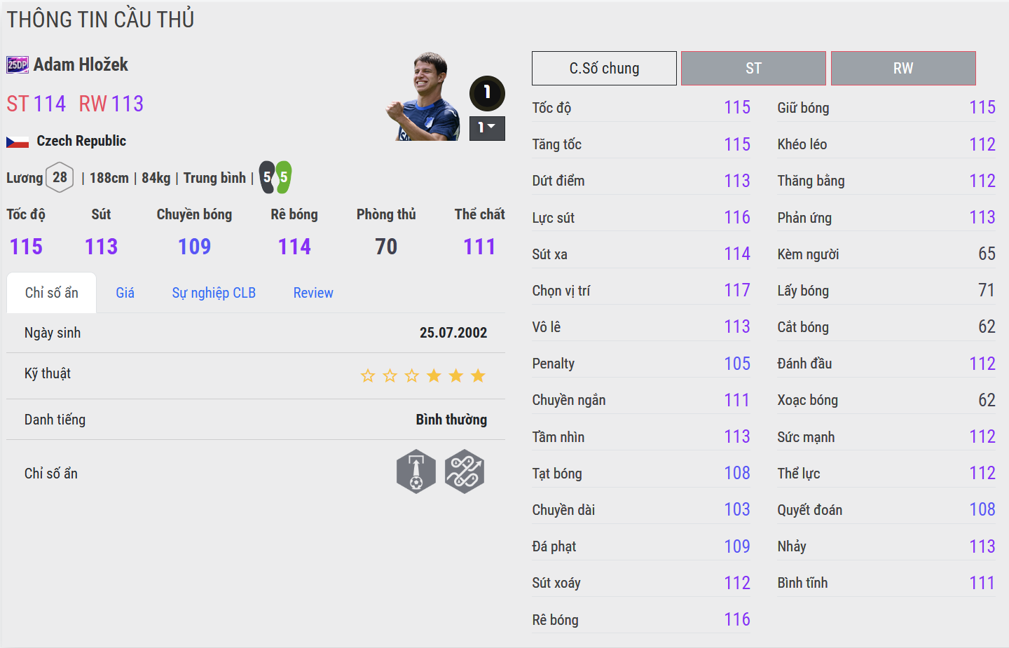 Hlozek 25DP là mẫu trung phong có lối chơi mạnh mẽ, trực diện và đầy năng lượng. Anh sở hữu tốc độ tốt, khả năng tì đè ấn tượng cùng những pha dứt điểm một chạm cực kỳ quyết đoán. Trong gameplay, Hlozek mang lại cảm giác “nhiệt” – luôn áp sát, pressing không ngừng và sẵn sàng tạo đột biến bằng sức trẻ. Một lựa chọn phù hợp cho những đội bóng chuộng lối chơi nhanh, dồn dập và giàu thể lực.