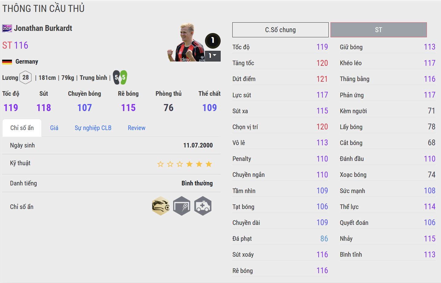 Burkardt 25DP là hình mẫu của sự ổn định và cần cù. Anh di chuyển khôn ngoan, chọn vị trí tinh tế và luôn có mặt đúng thời điểm trong vòng cấm. Dù không sở hữu thể hình quá lý tưởng, Burkardt lại biết cách bù đắp bằng khả năng xử lý bóng gọn gàng và dứt điểm chính xác. Trong gameplay, anh là tiền đạo đáng tin cậy – không hoa mỹ, nhưng cực kỳ hiệu quả trong các pha phối hợp nhỏ hoặc phản công nhanh.