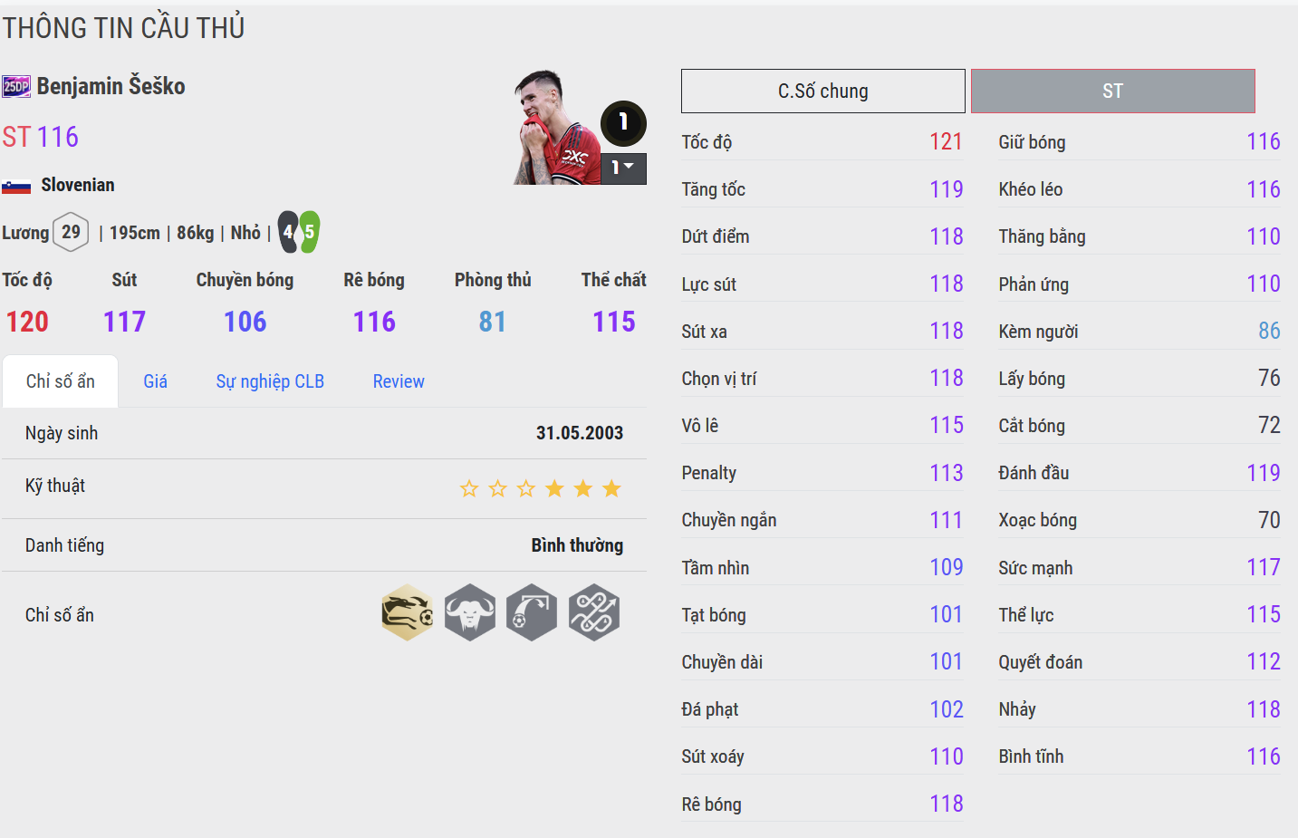 Šeško 25DP mang dáng dấp của một tiền đạo hiện đại: cao lớn, nhanh nhẹn và dứt điểm cực gọn. Anh biết cách dùng thể hình để che chắn, phối hợp tốt trong không gian hẹp và đặc biệt nguy hiểm khi xâm nhập vòng cấm. Trong gameplay, Šeško là mẫu trung phong toàn diện – vừa có thể làm tường, vừa tự mình ghi bàn, phù hợp cho lối chơi tấn công trực diện hoặc kiểm soát nhịp độ.