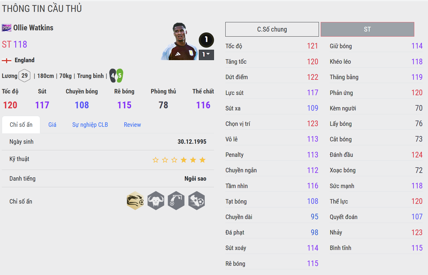 Watkins 25DP là biểu tượng của sự bền bỉ và khát khao. Anh không chỉ nhanh, khéo mà còn có cảm giác vị trí tuyệt vời cùng khả năng dứt điểm ổn định bằng cả hai chân. Trong gameplay, Watkins tạo ấn tượng với AI di chuyển thông minh, thường xuyên thoát xuống đúng lúc và tận dụng cơ hội cực tốt. Một tiền đạo “chuẩn Devoted”: không hoa mỹ, không ồn ào, nhưng luôn là người mang về khác biệt trong những thời khắc quan trọng.