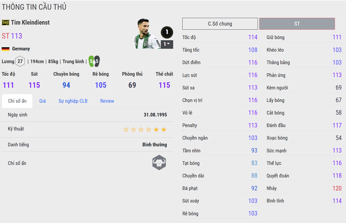 Kleindienst 24EP là mẫu trung phong thuần túy, mang đậm chất “Cỗ xe tăng” với lối chơi trực diện và giàu thể lực. Anh mạnh trong tranh chấp, làm tường và tận dụng tốt các tình huống bóng bổng trong vòng cấm. Không hoa mỹ, Kleindienst tạo giá trị bằng sự cần mẫn, đơn giản và hiệu quả, rất phù hợp với những lối đá thiên về tạt cánh và áp đặt thể hình.