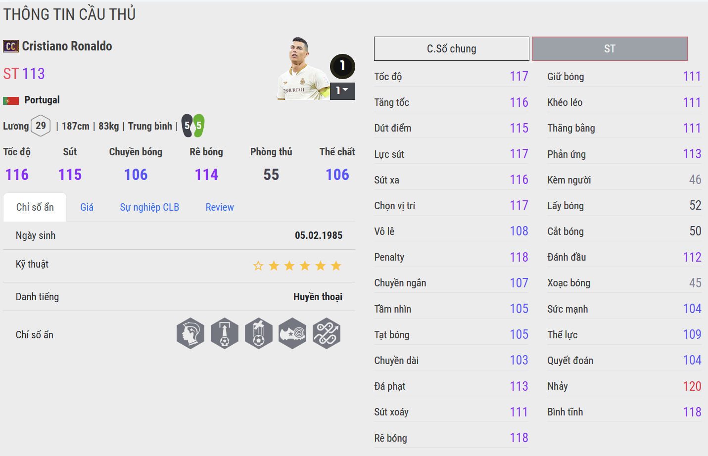 Ronaldo CC vẫn là một phiên bản cực kì ấn tượng với lối chơi toàn diện từ tốc độ, thể hình tranh chấp, không chiến, rê dắt cho tới đa dạng về khả năng dứt điểm. Ở mức thẻ cộng cao, phiên bản này vẫn cho thấy hiệu quả tốt, thích nghi đa dạng với nhiều meta cũng như sơ đồ chơi khác nhau từ lối chơi ban bật tốc độ cho đến tiền đạo mục tiêu dạng không chiến.
