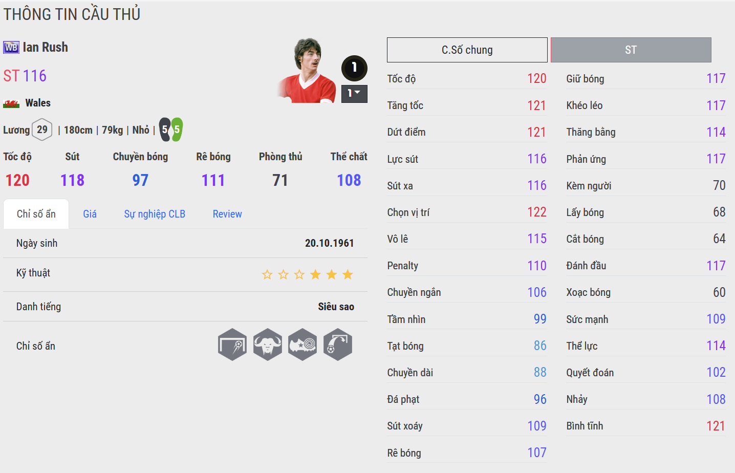 Ian Rush có lối chơi khá tương đồng với Pele trong FC Online, thể hình nhỏ nhưng sở hữu tốc độ nổi trội, khả năng di chuyển và đánh hơi khoảng trống cực kì nhạy bén cùng bộ kỹ năng dứt điểm đa dạng bằng cả 2 chân với lực sút tốt và độ ổn định cao. Không chỉ có vậy, khả năng không chiến của tiền đạo xứ Wales cũng khá ổn giúp anh trở nên linh hoạt, đa dạng hơn và phù hợp cho nhiều lối chơi khác nhau khi cần.