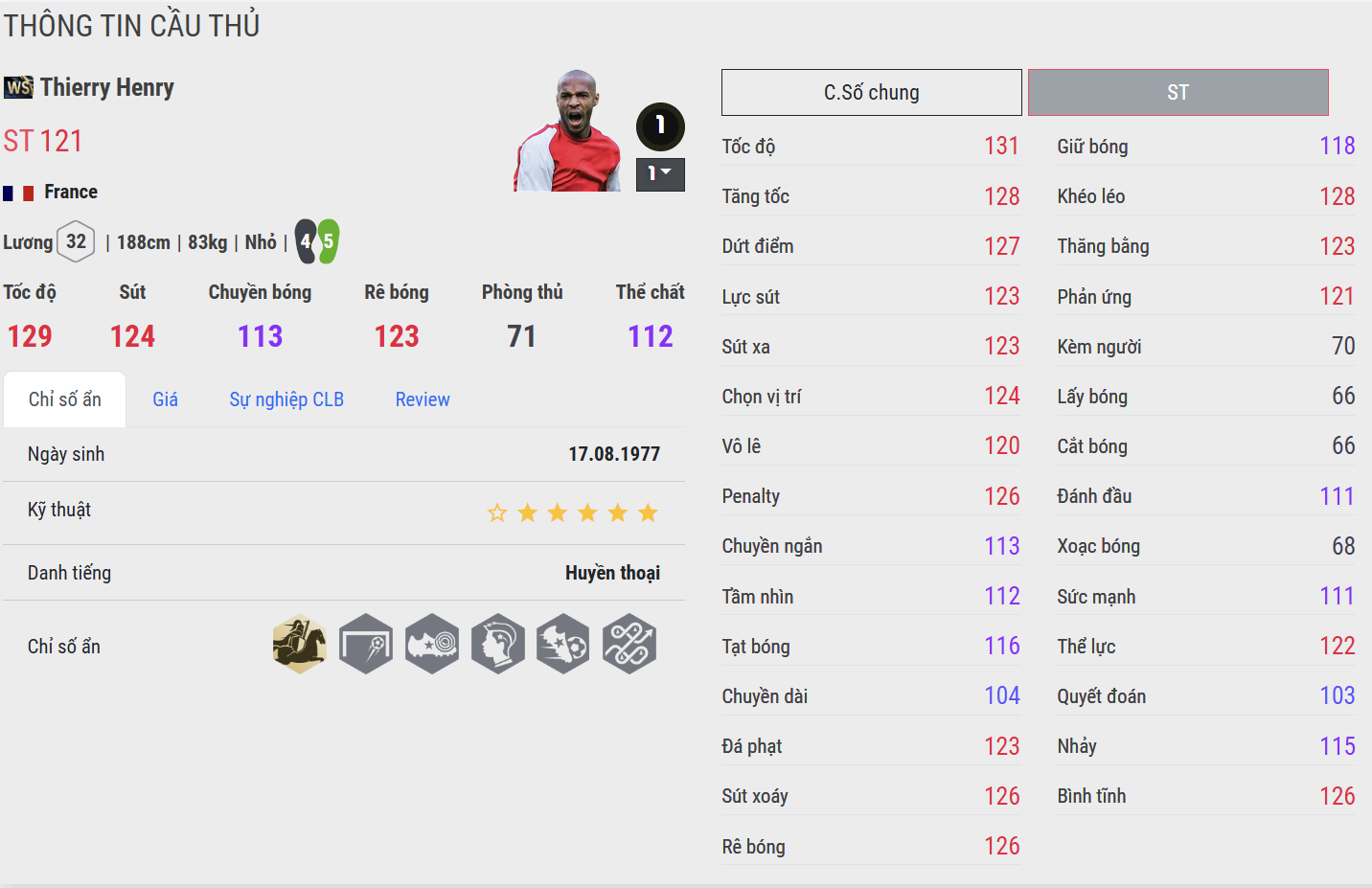 Huyền thoại Arsenal mang đến tốc độ xé gió cùng những pha dứt điểm lạnh lùng. Henry WS là mẫu tiền đạo vừa giàu đột biến, vừa có khả năng tự mình xoay chuyển cục diện trận đấu.