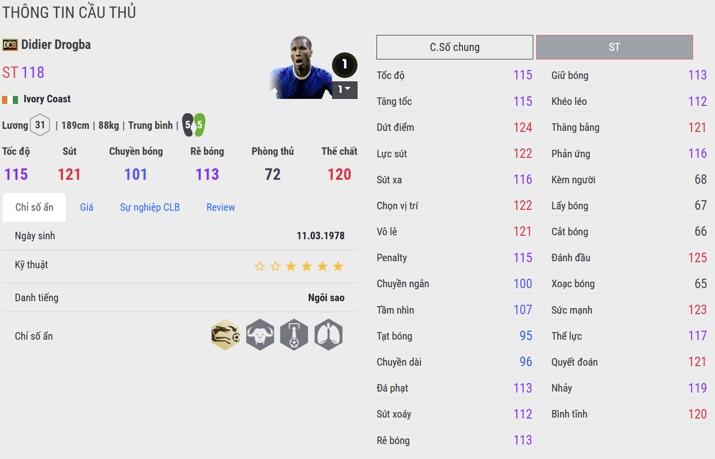 Drogba DCB là hiện thân của sức mạnh, bản lĩnh và sự bùng nổ đúng lúc. Trong gameplay, anh nổi bật với khả năng tì đè khủng, dứt điểm dứt khoát cùng những cú đánh đầu như búa bổ. Đây là mẫu tiền đạo luôn biết cách tỏa sáng ở những khoảnh khắc khó khăn nhất, mang lại cảm giác “gánh team” đúng nghĩa.