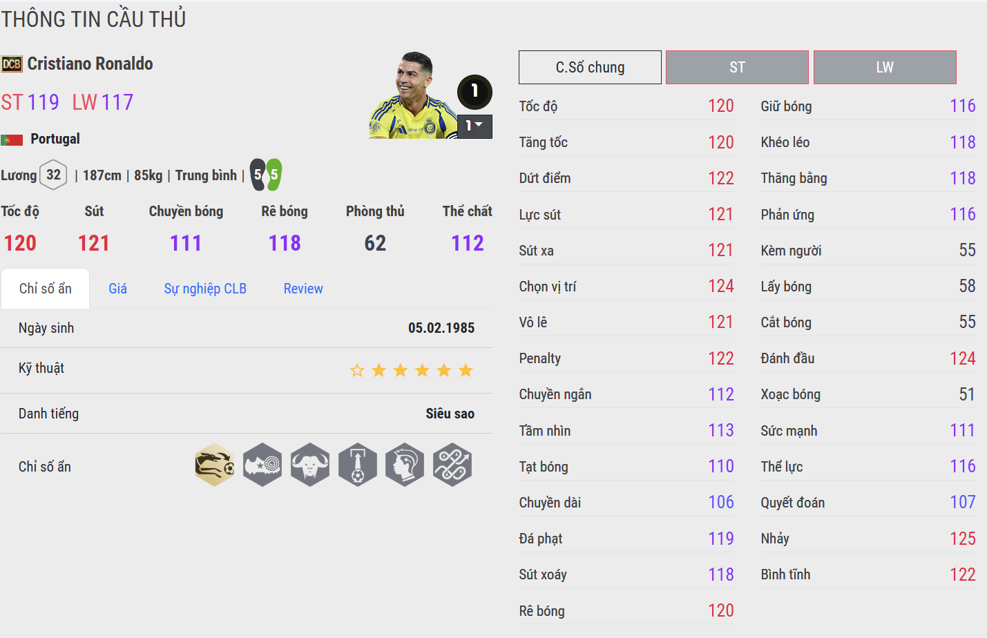 C. Ronaldo DCB là cái tên xứng đáng nhất ở vị trí số 1. Anh hội tụ đầy đủ phẩm chất của một siêu sao: tốc độ, sức bật, khả năng không chiến, dứt điểm đa dạng và đặc biệt là sự lạnh lùng trong những tình huống quyết định. Đây chính là thẻ mùa mang lại cảm giác “gánh đội” đúng nghĩa, nơi mọi pha bóng có thể kết thúc bằng khoảnh khắc bùng nổ của CR7.