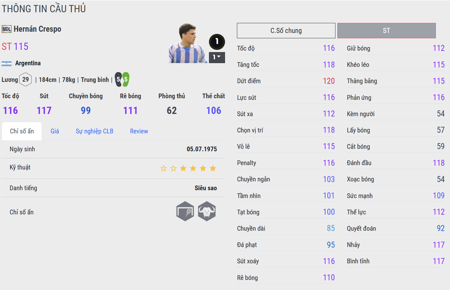 Crespo MDL là mẫu số 9 thuần túy với bản năng săn bàn cực cao. Anh di chuyển thông minh, chọn vị trí sắc sảo và dứt điểm rất gọn trong phạm vi hẹp. Trong gameplay, Crespo không cần quá nhiều khoảng trống – chỉ một nhịp chậm của hàng thủ đối phương là đủ để anh trừng phạt.