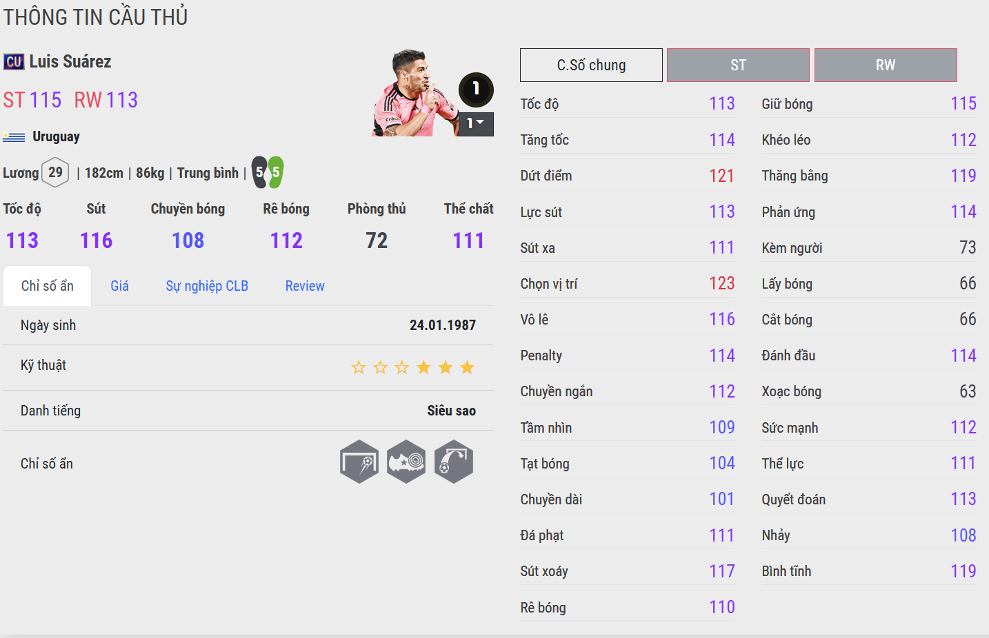 Suárez CU là mẫu tiền đạo giàu năng lượng và cực kỳ “khó chịu”. Anh pressing rát, xoay sở tốt trong phạm vi hẹp và luôn biết cách tạo ra đột biến từ những tình huống tưởng như vô hại. Đây là tiền đạo chơi bằng bản năng, cảm xúc và sự tinh quái rất đặc trưng của Liverpool.