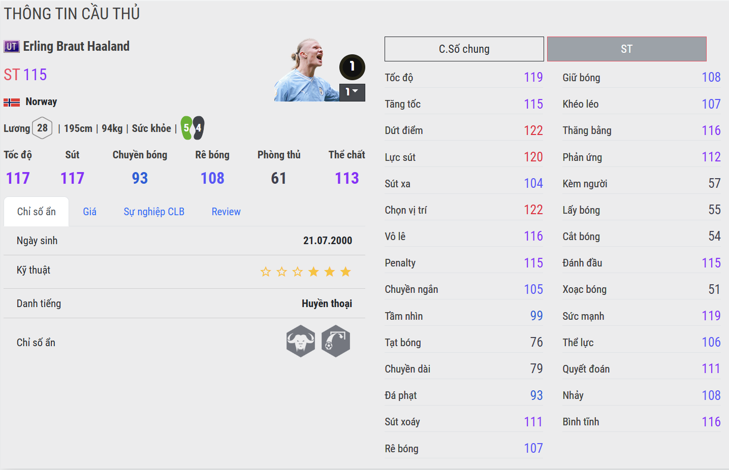 Haaland UT là phiên bản mang đến sự ổn định và hiệu quả đúng chất một trung phong Man City. Anh mạnh mẽ trong vòng cấm, chọn vị trí tốt và dứt điểm rất gọn gàng. Dù khả năng tham gia lối chơi chung chưa phải điểm mạnh nhất, Haaland UT vẫn phát huy giá trị rõ rệt ở khâu kết thúc, đặc biệt trong những tình huống cần một pha chạm để chuyển hóa cơ hội thành bàn thắng.