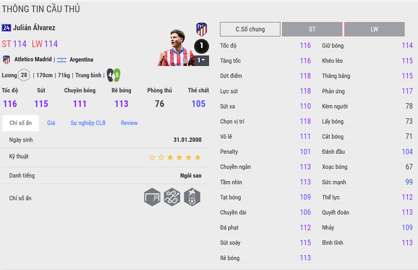 Álvarez 24UCL đại diện cho mẫu tiền đạo hiện đại của Man City: linh hoạt, thông minh và giàu tính kết nối. Anh di chuyển rộng, chịu khó lùi sâu phối hợp và tham gia pressing rất tích cực. Trong gameplay, Álvarez mang đến cảm giác “trơn tru” trong vận hành lối chơi, phù hợp với các đội hình cần tiền đạo hòa nhập tốt vào hệ thống kiểm soát bóng.