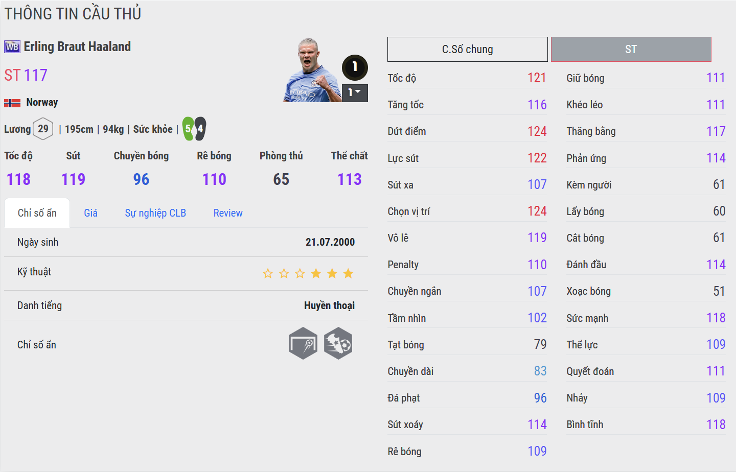 Haaland WB là phiên bản cân bằng hơn giữa sức mạnh và khả năng tham gia lối chơi. Anh vẫn giữ được sự áp đảo trong tranh chấp và dứt điểm, nhưng xử lý bóng gọn gàng hơn, di chuyển thông minh hơn so với các bản thấp hơn. Trong meta, Haaland WB rất nguy hiểm ở những pha tấn công có nhịp độ cao, nơi anh tận dụng tối đa không gian trong vòng cấm.