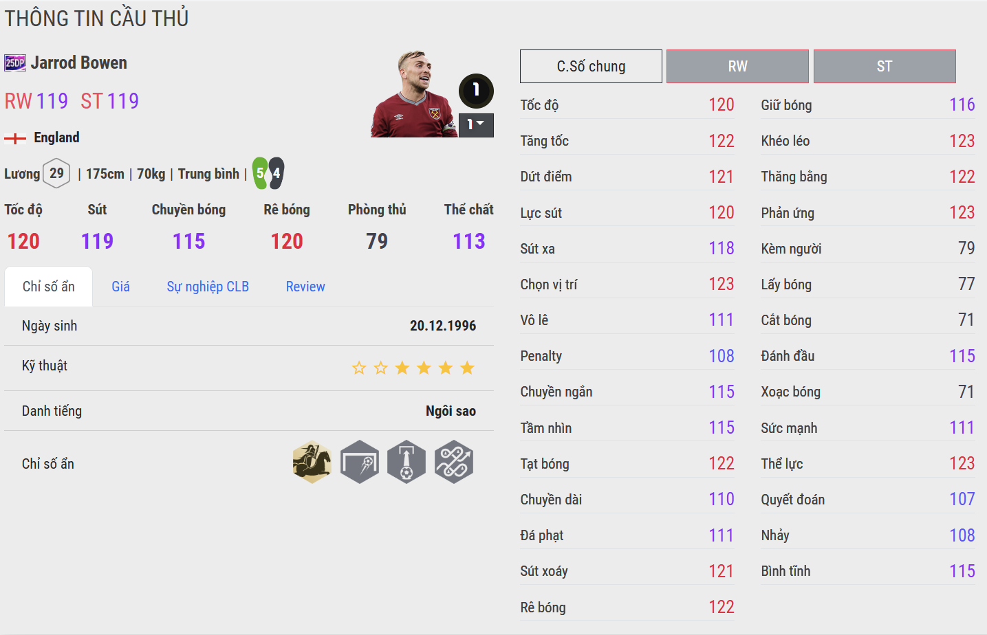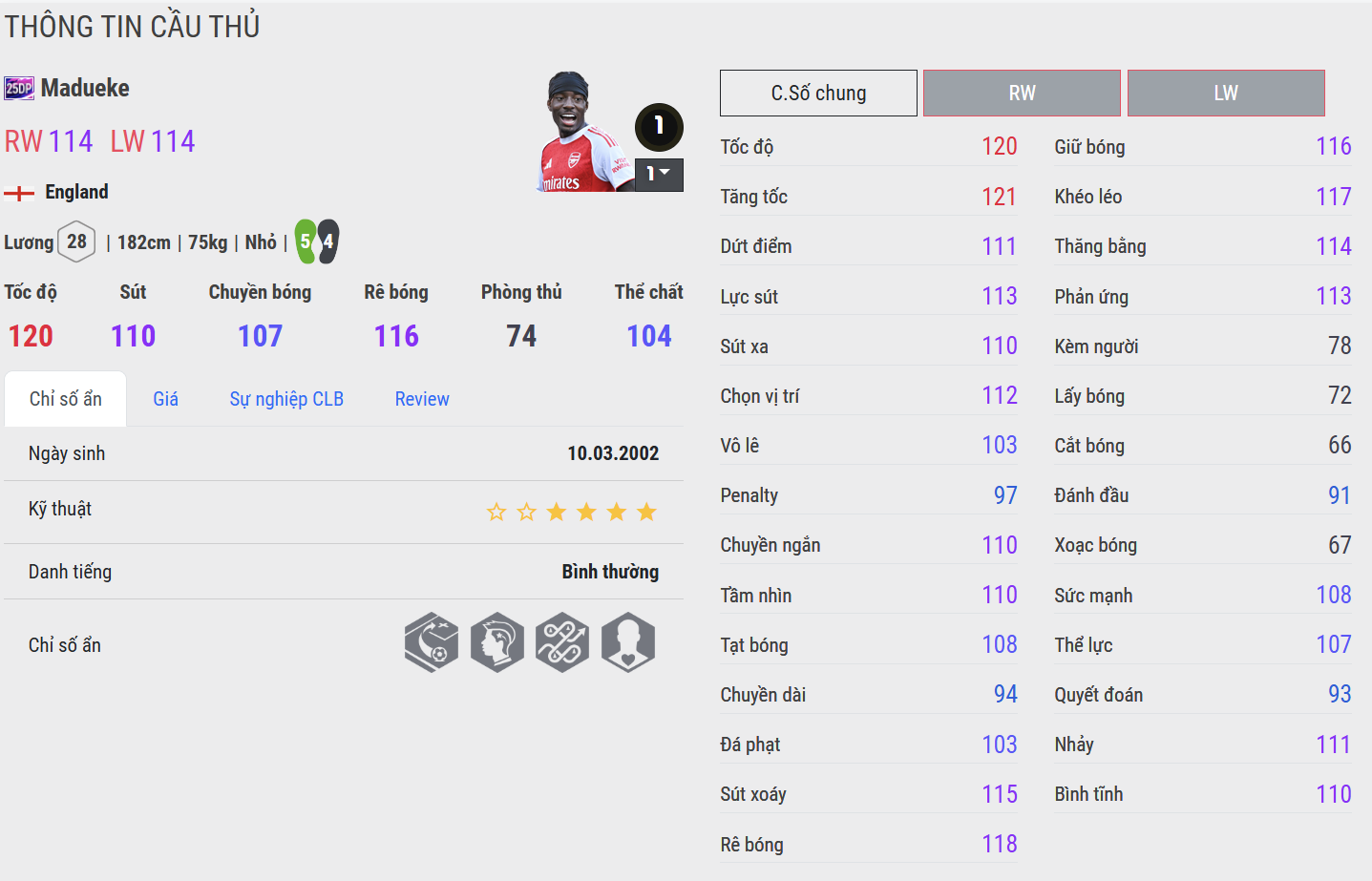 Madueke mang đến sự bùng nổ thuần túy ở biên phải với bộ chỉ số tốc độ – rê bóng nổi bật. Anh di chuyển linh hoạt, đảo hướng nhanh và dễ dàng vượt qua các hậu vệ trong những pha 1v1. Dù khả năng dứt điểm chưa quá xuất sắc, Madueke vẫn tạo ra sự nguy hiểm nhờ vào những pha xộc thẳng vào vòng cấm. Sự nhiệt tình trong hỗ trợ phòng ngự giúp anh trở thành lựa chọn cân bằng, phù hợp với lối chơi pressing và kiểm soát nhịp độ ở biên.