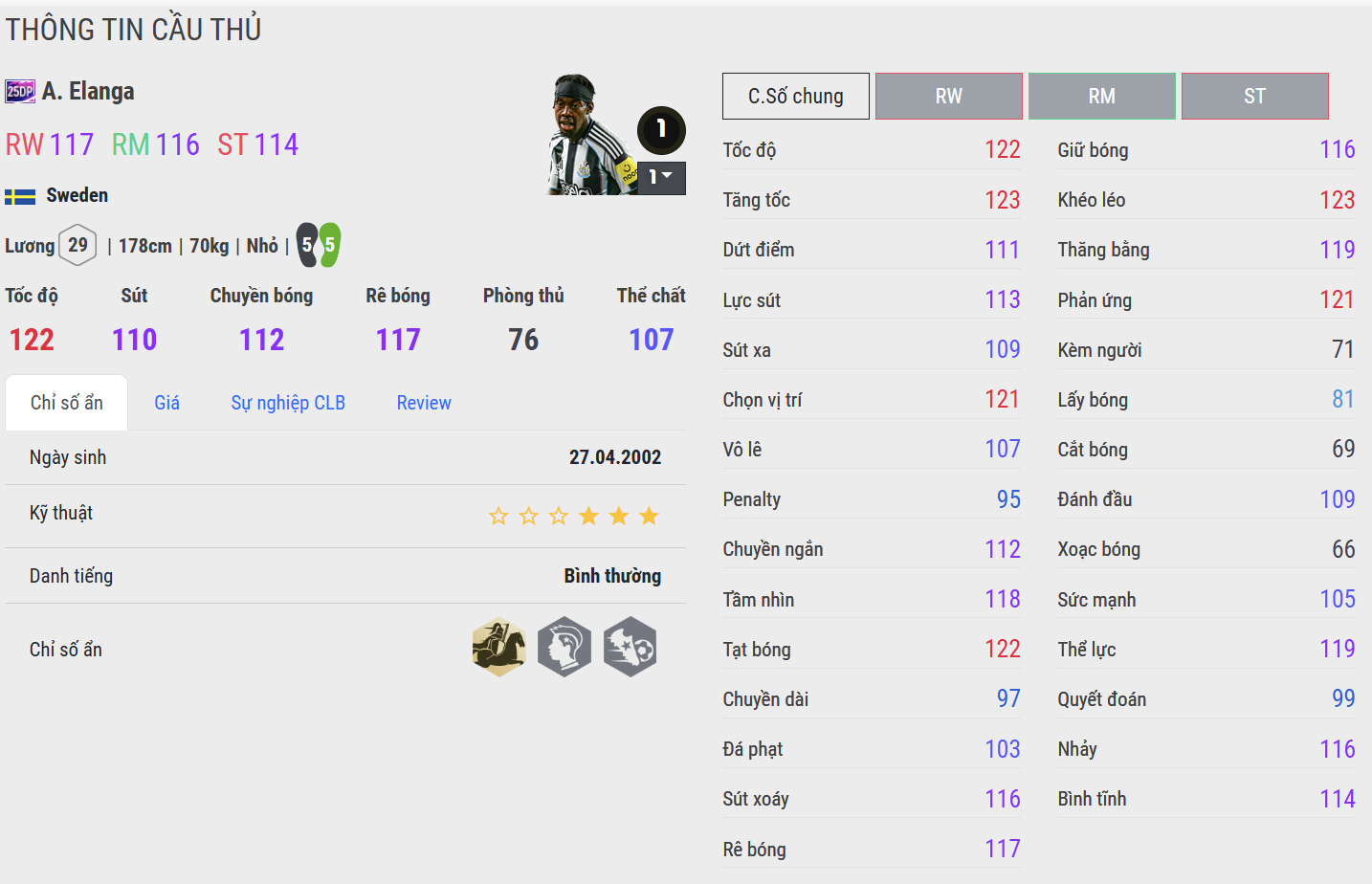 Elanga là mẫu tiền vệ phải mang thiên hướng tốc độ và di chuyển không bóng rất thông minh. Anh bứt tốc mạnh, thả bóng dài hiệu quả và phù hợp với các pha phản công nhanh. Lối chơi năng nổ giúp Elanga thường xuyên có mặt ở những điểm nóng để tranh chấp hoặc hỗ trợ tấn công. Khâu xử lý bóng đôi khi chưa thật mượt nhưng đổi lại, Elanga mang lại cảm giác “chạy không biết mệt” – một lựa chọn an toàn cho các đội hình cần sự cơ động.