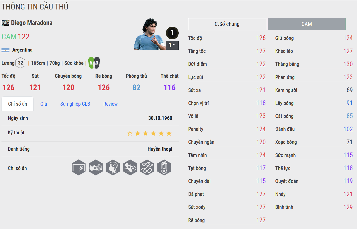 Maradona FAC là biểu tượng của nghệ thuật và sự bùng nổ. Anh có khả năng rê bóng thần sầu, xử lý trong phạm vi hẹp và mở ra những pha đột phá bất ngờ. Trong gameplay, Maradona không chỉ dẫn dắt nhịp độ mà còn thường xuyên tạo ra khoảnh khắc định đoạt trận đấu – một “người nghệ sĩ” thực thụ nơi trung tuyến.