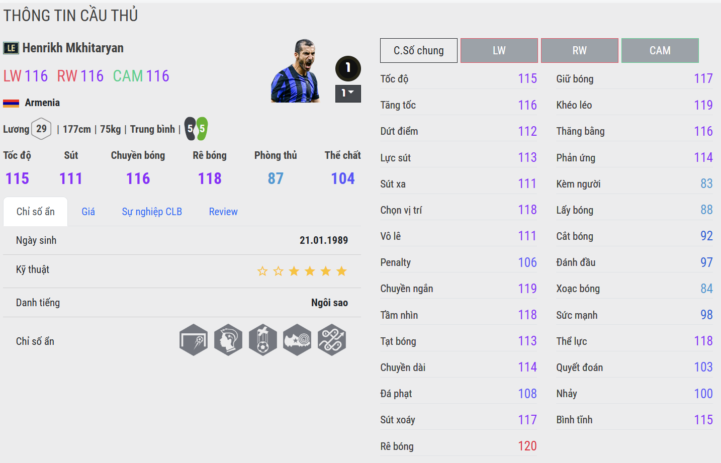 Mkhitaryan LE là lựa chọn cân bằng giữa sáng tạo và hiệu quả. Anh di chuyển thông minh, phối hợp tốt và có khả năng xâm nhập vòng cấm để dứt điểm khi cần. Trong thực chiến, Mkhitaryan mang lại cảm giác ổn định, dễ dùng và rất phù hợp với lối chơi ban bật – kiểm soát.