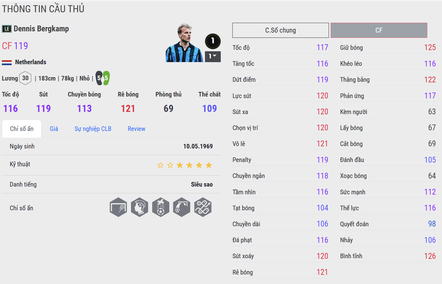 Bergkamp GRU là đỉnh cao của mẫu số 10 cổ điển pha hiện đại. Mọi pha chạm bóng đều mang tính định hướng: từ giữ nhịp, xoay trở, chọc khe đến dứt điểm lạnh lùng. Phiên bản này không chỉ kiến tạo lối chơi mà còn trực tiếp định đoạt trận đấu – một CAM/CF mang đẳng cấp biểu tượng trong FC Online.