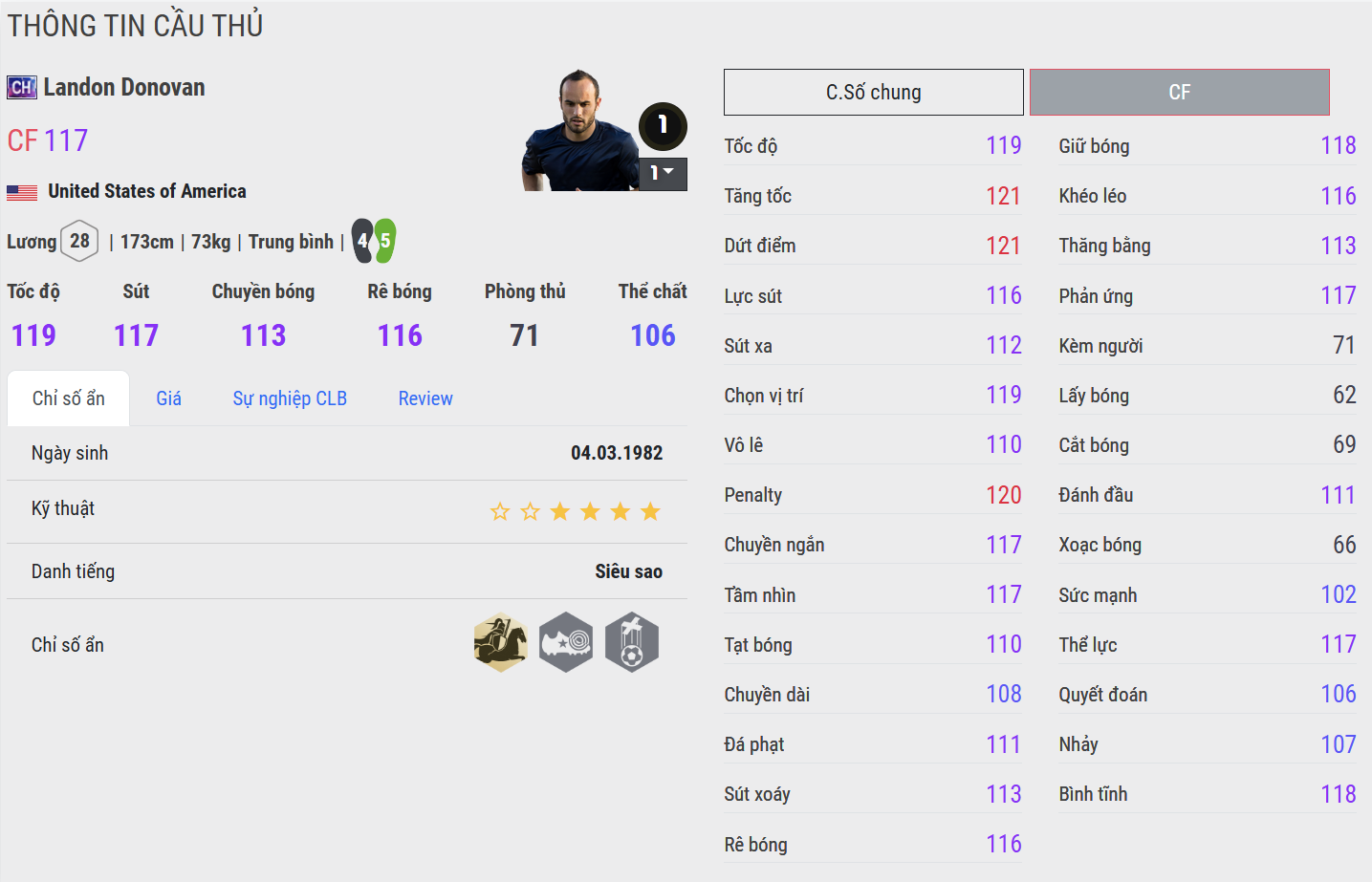 Landon Donovan CH là mẫu cầu thủ tấn công khá linh hoạt với tốc độ tốt và khả năng di chuyển thông minh. Donovan thường xuyên xuất hiện ở những khoảng trống thuận lợi để tham gia dứt điểm hoặc phối hợp với đồng đội. Phiên bản này mang lại cảm giác chơi khá ổn định, đặc biệt phù hợp với lối đá nhanh và tận dụng các tình huống phản công.