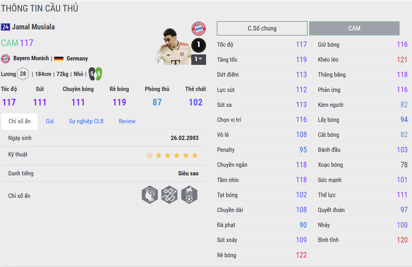 Jamal Musiala WB là phiên bản toàn diện và bùng nổ nhất trong danh sách này. Musiala sở hữu tốc độ tốt, kỹ thuật cá nhân cực kỳ mượt và khả năng rê bóng rất khó bị cản phá. Những pha xử lý linh hoạt cùng khả năng tạo đột biến liên tục giúp anh trở thành nhân tố tấn công cực kỳ nguy hiểm, có thể tạo ra sự khác biệt chỉ trong vài nhịp chạm bóng.