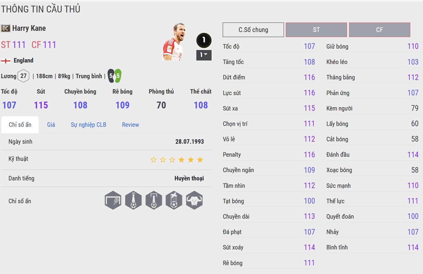Harry Kane WB là phiên bản tiền đạo toàn diện với khả năng dứt điểm cực kỳ sắc bén. Kane không chỉ mạnh trong vòng cấm mà còn có thể lùi xuống làm tường và tham gia kiến tạo nhờ khả năng chuyền bóng tốt. Khả năng chọn vị trí thông minh cùng những cú sút có độ chính xác cao khiến Kane WB luôn là mối đe dọa lớn trước khung thành đối phương.