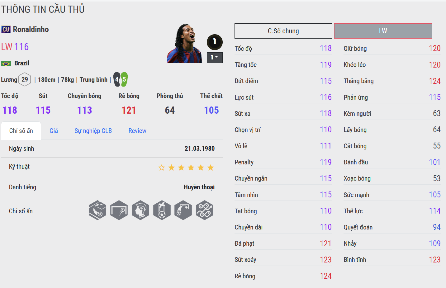 Ronaldinho CU mang đến hình ảnh một “ảo thuật gia” đúng nghĩa với khả năng rê bóng cực kỳ mềm mại và ngẫu hứng. Anh có thể xử lý trong không gian hẹp rất tốt, tạo ra những pha bóng khó lường. Tuy nhiên, phiên bản này thiên về cảm hứng nhiều hơn là sự ổn định trong dứt điểm.