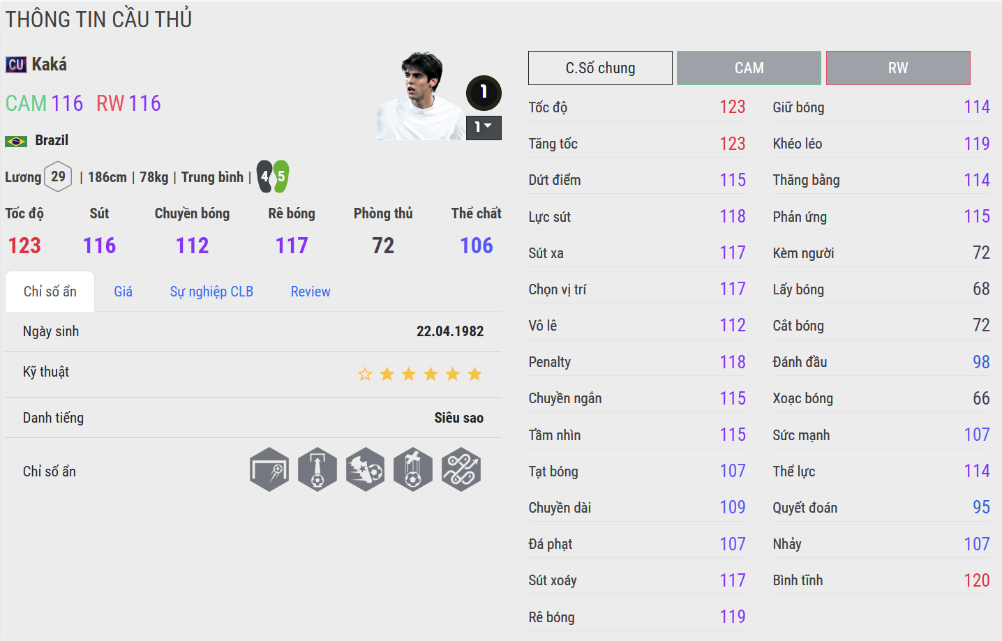 Kaká CU lại là mẫu CAM thiên về tốc độ và khả năng bứt phá. Những pha dẫn bóng thẳng vào trung lộ với sải chân dài giúp Kaká dễ dàng xuyên phá hàng thủ đối phương. Dù kỹ thuật không quá lắt léo, nhưng sự hiệu quả trong các tình huống chuyển trạng thái là điểm mạnh lớn.